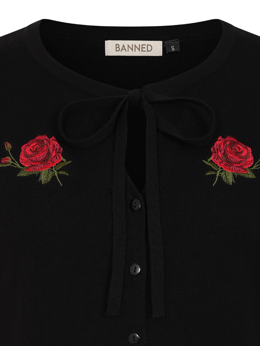 I never promised you a rose garden ... Na, haben Sie gerade mit Lynn Anderson mitgesummt? Dieser wunderschöne Damen-Cardigan im 50er Jahre Rockabilly Stil "Mia Rose Garden Cardigan" von Banned sorgt für rosige Zeiten in Ihrem Kleiderschrank! Garantiert ohne Dornen, dafür kuschelweich und mit traumhafter Rosen-Stickerei vorne auf der Brust. Der taillenkurze Cardigan hat einen runden Ausschnitt mit Keyhole-Öffnung vorn und niedlicher Schleife zum Binden. Die halblangen Ärmel machen diesen Damen-Cardigan im Vintage-Stil zu Ihrem idealen Begleiter durch alle Jahreszeiten. Durchgehende Knopfleiste vorn, Rippstrick an Ärmel- und Taillenbündchen. Kombinieren Sie diese niedliche Strickjacke im Vintage-Look über ein Vintage-Kleid, zu einem 50er Jahre Swingrock oder zu einer klassischen Marlenehose und bringen Sie so eine Prise Rock'n'Roll in Ihren Alltag.