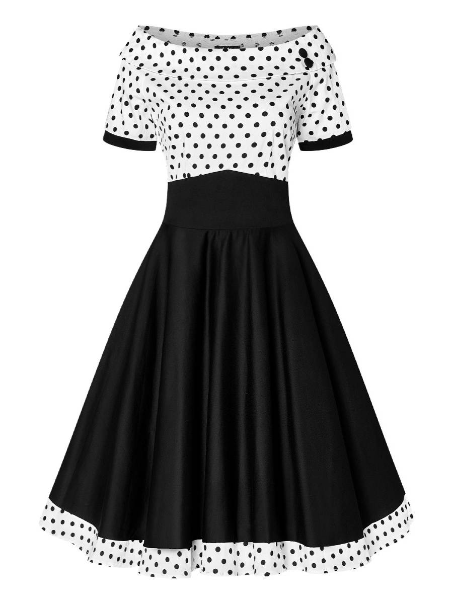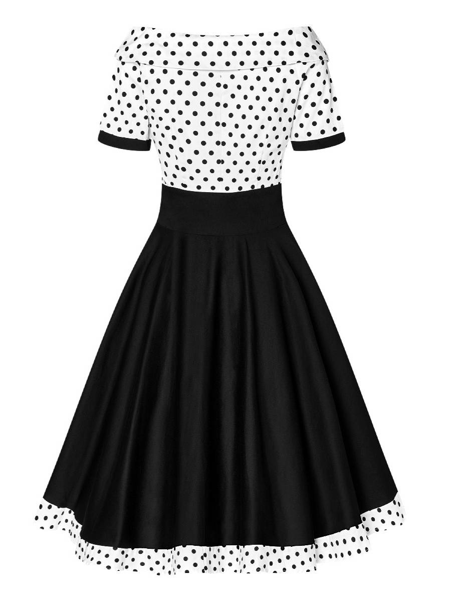 That's Rockabilly! Süßes Petticoatkleid "Darlene Polka Swing Dress in White Black" von Dolly & Dotty mit weitem U-Boot-Ausschnitt, kurzen Ärmeln und weit schwingendem Rock. Das Oberteil hat schwarze Polkadots auf weißem Grund und ist schön auf Figur geschnitten mit einem 8,5 cm breiten Taillenband. Schwarze Zierpaspeln an den Ärmeln, zwei schwarze Zierknöpfe am Kragen, seitlicher Reißverschluss. Besonders hübsch: Der weiß-schwarze Polkadot-Besatz am Saum.