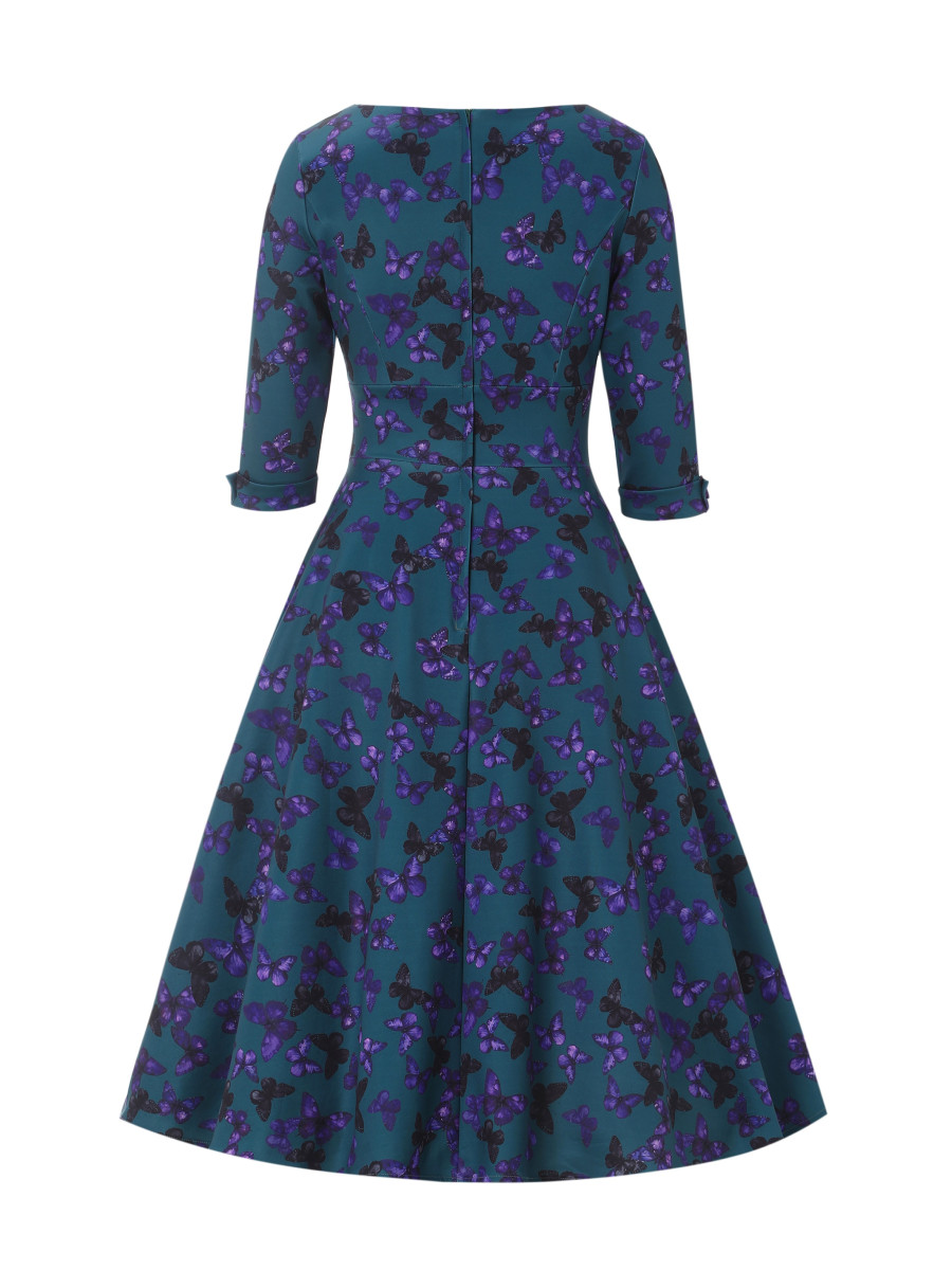 Petrolfarbenes Petticoatkleid im 50er Jahre Stil mit lila Schmetterlingen