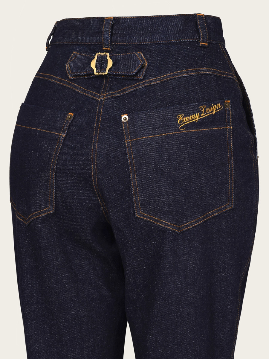 Vorne zwei schräge Taschen, eine davon verdeckt den Reißverschluss - dieser kleine Trick und der taillenhohe Schnitt machen einen extra-flachen Bauch. Genau wie bei den Original-Jeans der 1940er Jahre! Und genau wie Damen-Jeans der 50er sind diese Jeans im Vintage-Stil extra-lang (Gesamtlänge an der Außennaht: 120 cm), um sie stilecht 50s-mäßig zu krempeln. Zwei klassische Hosentaschen hinten, mit der praktischen Schnalle aus Messing kann die Weite zusätzlich reguliert werden für einen knackigen Sitz am Po. Dunkelblauer, schwerer Denim-Stoff mit gelben Nähten und eingesticktem Emmy Design-Logo auf der rechten hinteren Hosentasche. Diese Damen-Jeans im Vintage-Stil passt perfekt zu einem 50s Casual Look mit Ihrem Lieblingspullover, mit einer schicken Vintage-Bluse und High Heels wird sie ausgehfein. Nicht nur schön, sondern auch extra strapazierfähig - genau so muss eine Jeans sein!