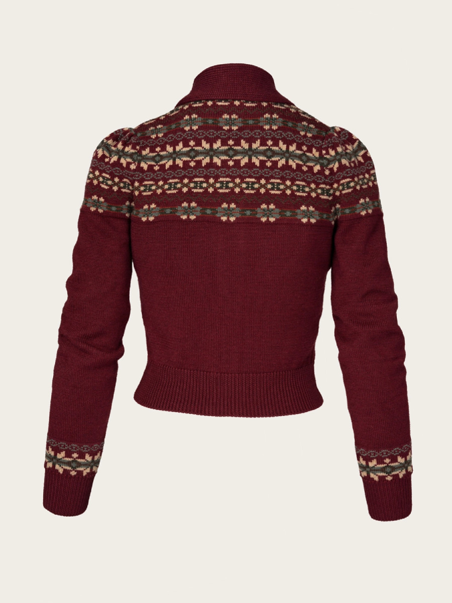 Strickjacke im Vintage-Stil für Damen aus weinroter Merinowolle mit Fair Isle Strickmuster