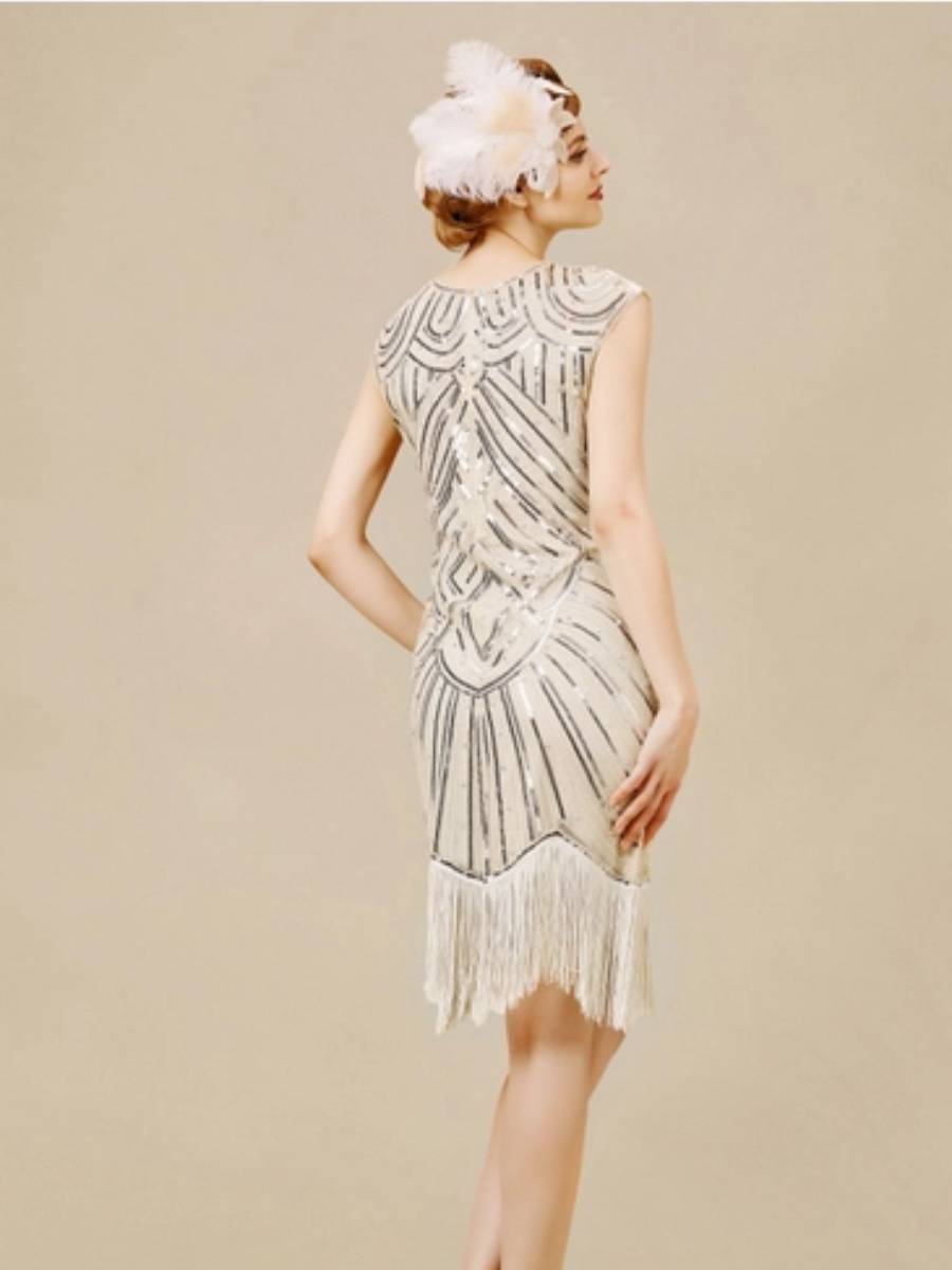 If disco balls had existed in the 1920s, this 1920s style dress would have given them a run for their money! This silver-grey flapper dress "Grey Silver Glitter Sequin V-Neck Art Deco Dress" by Babeyond features all-over silver sequin embroidery in a spectacular Art Deco pattern and will make you the dazzling centre of attention at any Gatsby party. With its sophisticated V-neckline and transparent tulle insert in front, this sleeveless 1920s dress showcases your glamourous bust and the long fringes at the hem will move to the rhythm of the Charleston when you dance.