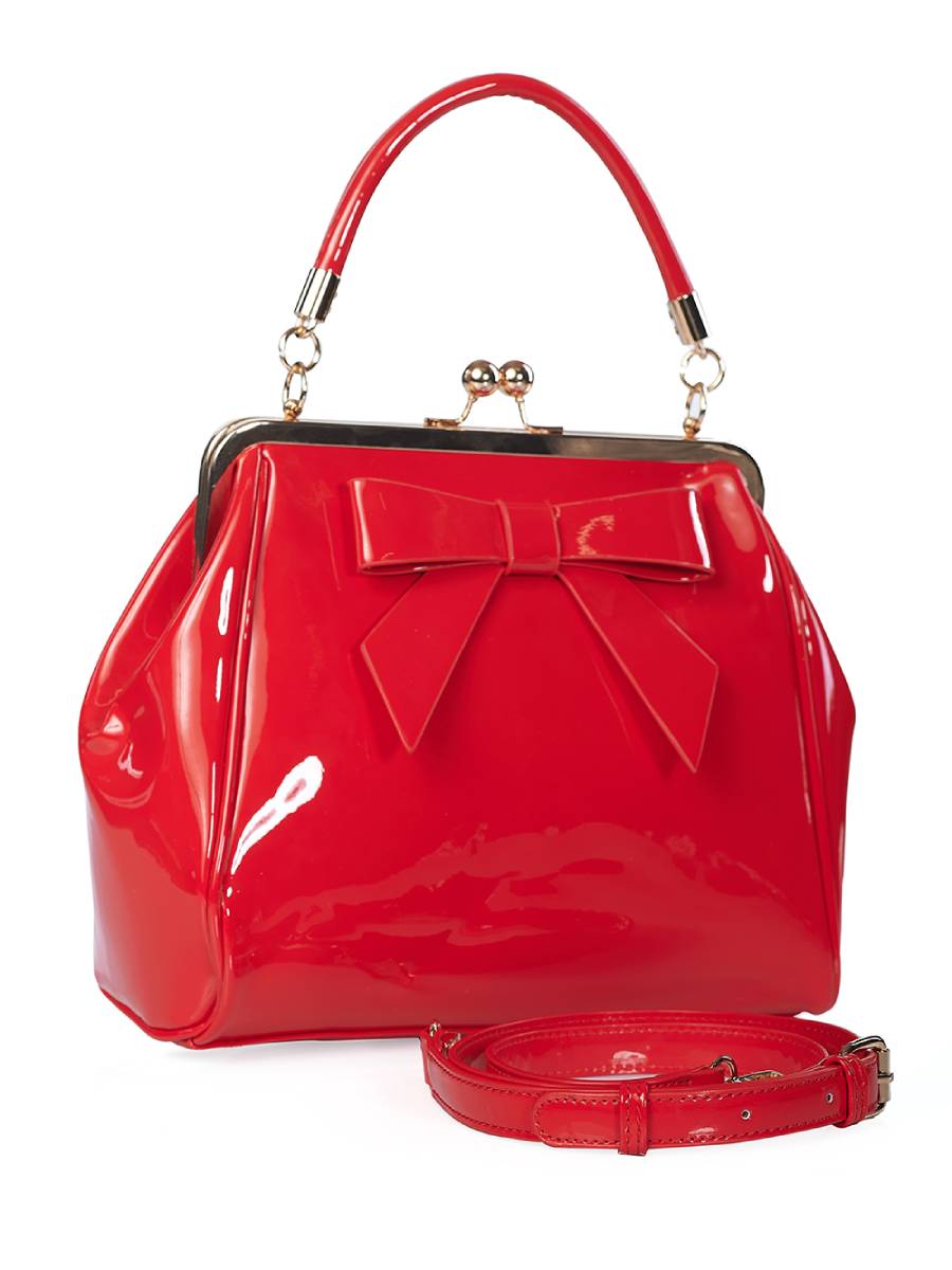 Inspired by classic cars of the 50s: Bright red faux patent leather handbag "American Vintage Bag Red" by Banned, featuring a cute bow in front and a kiss lock closure. Additional zipper compartment in back, red handle, brass-coloured metal trimmings. Matching red shoulder strap included. Red lining inside with several inside compartments, one with zipper.