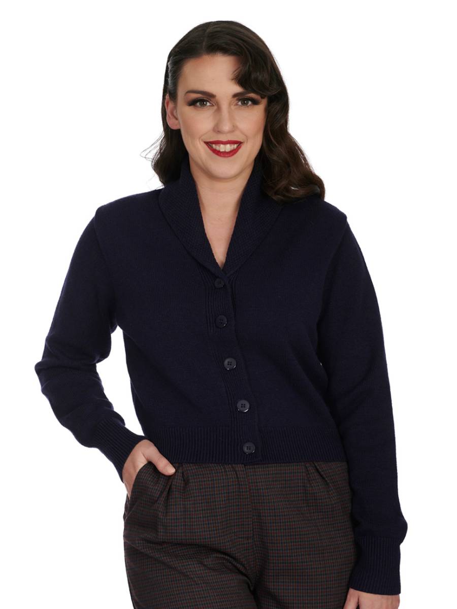 Imagine a vintage style cardigan that actually goes with ALL your favourite 1940s and 1950s styles - just look at this classic dark blue 1950s style cardigan "Violet Cardigan Night Blue" by Banned. It's perfect for teaming with your favourite winter skirt, a lovely warm dress or high-waist trousers. This comfortable vintage style cardigan features a V-neckline with shawl collar, high enough to keep out the wind, but low enough to show a pretty vintage scarf or the collar of your vintage style blouse. Full-length sleeves will keep you nice and warm, and the ribbed knit at the button facing, cuffs and hem is just like original knitwear of the era. Large vintage style buttons in front. A soft and cosy cardigan that will keep you company in winter.