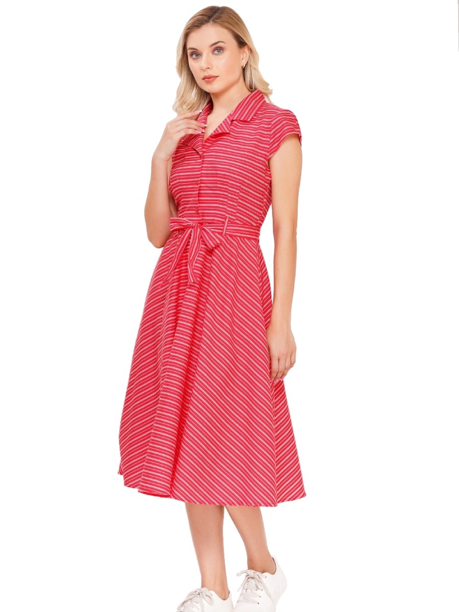 Red vintage style shirtwaister dress with cap sleeves and delicate white stripes