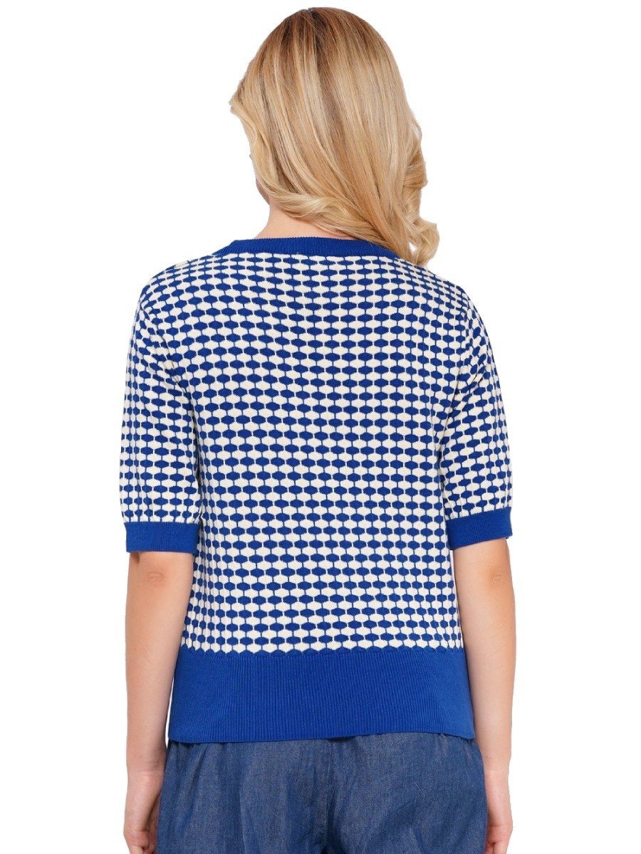 Organic cotton ladies' short sleeved jumper in a blue and white Op Art pattern
