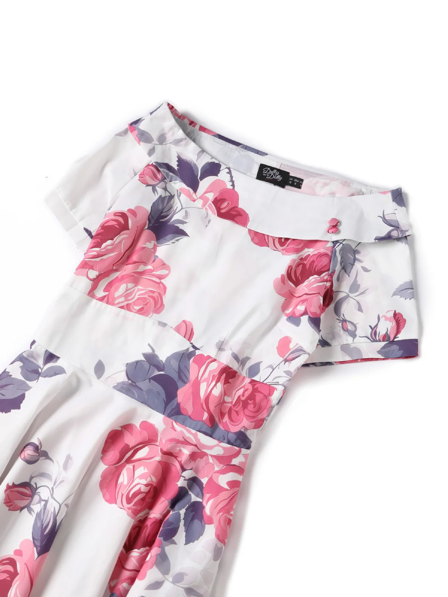 White 1950s style swing dress with pink rose print, boatneck collar and full circle skirt