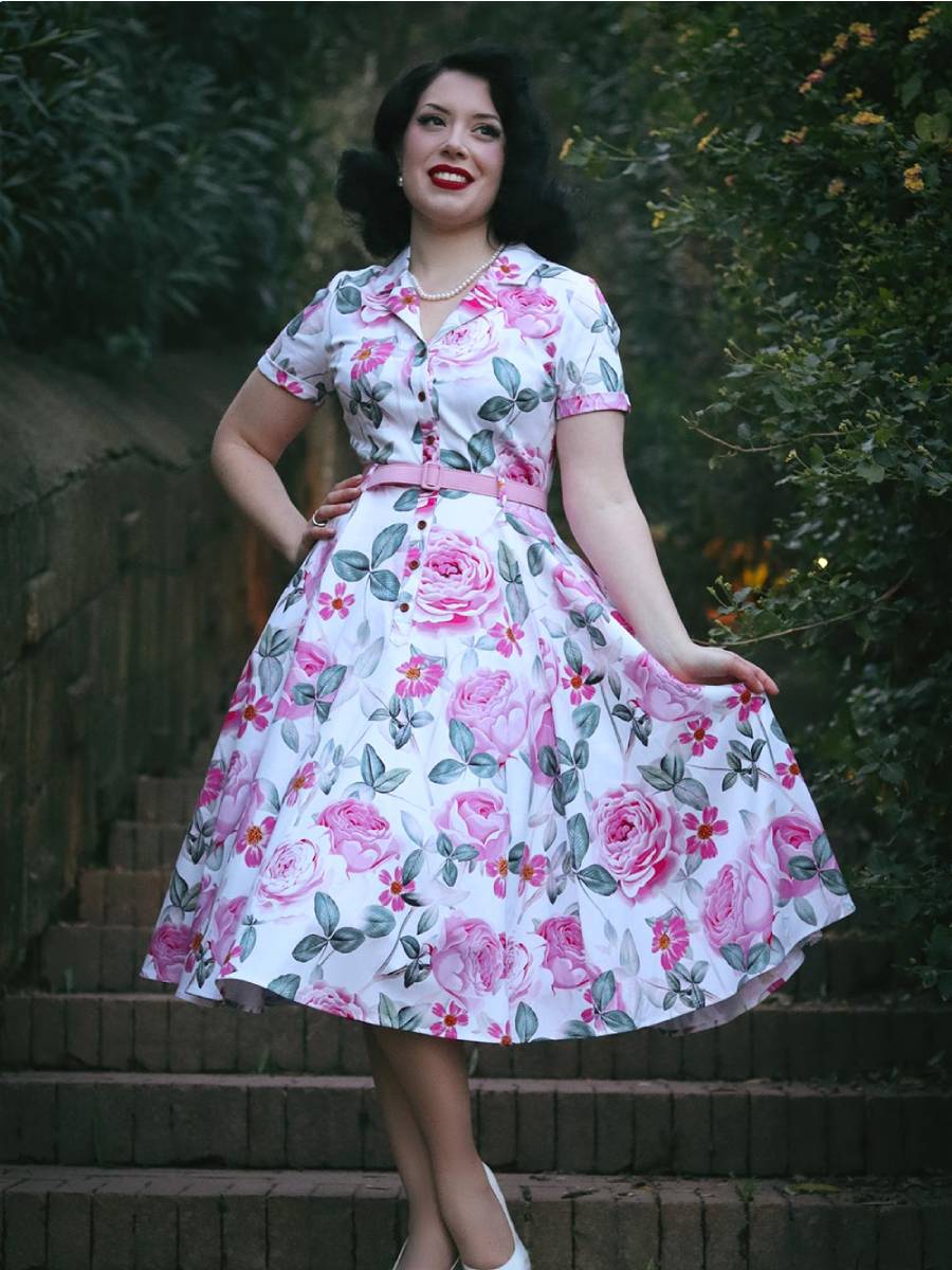 "Luella Floral Swing Dress Pink" von Hearts & Roses London ist ein bezauberndes 50er-Jahre Hemdblusenkleid mit rosa Rosenmuster – perfekt für romantische Anlässe. Figurbetontes Oberteil mit kurzen Ärmeln und schmeichelhaftem V-Ausschnitt mit klassischem Kragen. Das Kleid wird vorne mit rosa Knöpfen geschlossen. Weit schwingender Rock, perfekt für Petticoats. Zwei seitliche Eingrifftaschen im Rock, ein passender schmaler rosa Kunstledergürtel zaubert eine perfekte Pinup-Taille. Ein wunderschönes Kleid, um den Frühling zu genießen!