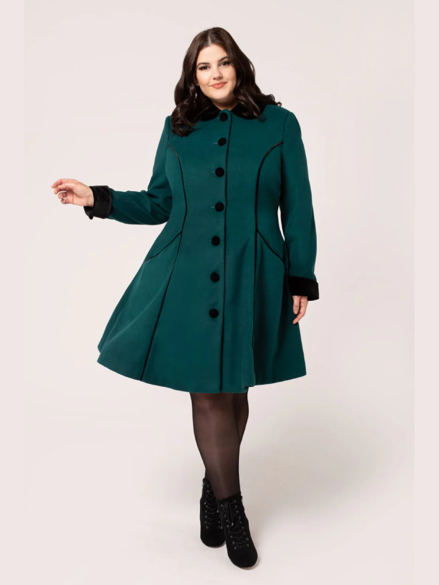 Auch bei Wind und Wetter bleiben Sie Ihrem Retro-Look treu - und das funktioniert wunderbar mit diesem traumhaften Mantel im Vintage-Stil "Harper Coat Green" von Hell Bunny. Der Vintage-Mantel in einem tollen Dunkelgrün ist hochgeschlossen und hält so den Wind draußen, Kragen und Ärmelbündchen sind mit schickem schwarzen Samt besetzt. Der taillierte Schnitt wird durch die samtigen schwarzen Prinzessnähte betont und lässt Sie bei jedem Wetter feminin und elegant wirken. Ab der Taille ist der Vintage-Mantel schön ausgestellt und passt so perfekt über Ihre Swingkleider und ausgestellten Fifties-Röcke. Mit seinen edlen samtbezogenen Knöpfe vorne hält dieser traumhafte Mantel im Vintage-Stil Sie kuschlig warm, auch der Mantelstoff fühlt sich samtig an. Innen ist der Mantel im Retro-Look mit schwarzem Satin gefüttert, damit er beim Anziehen ideal über Ihr Outfit gleitet. Ein echtes Lieblingsstück, das Sie sicher mehr als einen Winter begleiten wird!