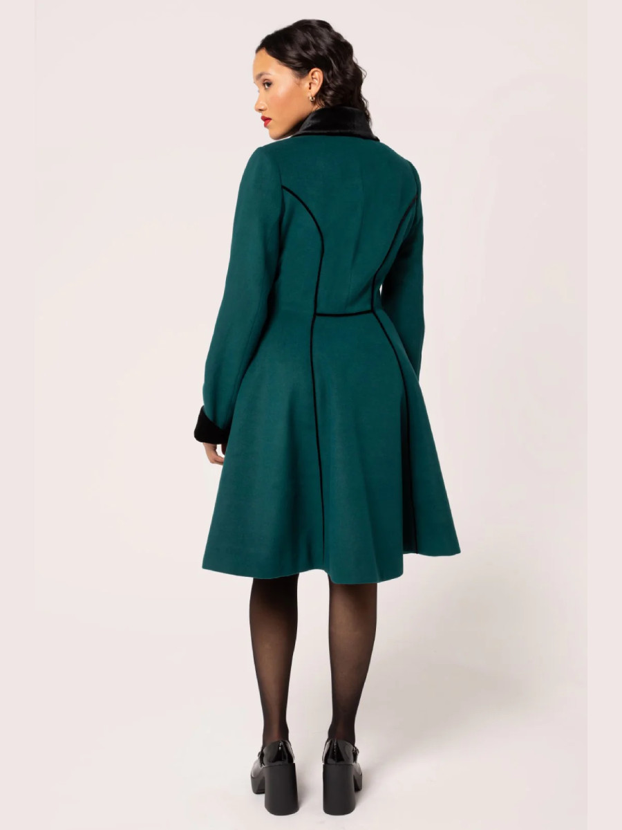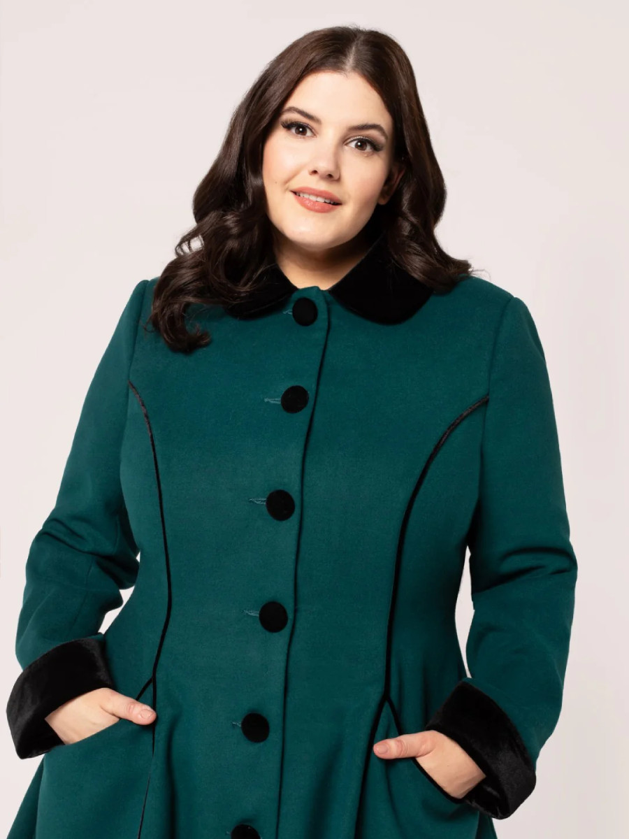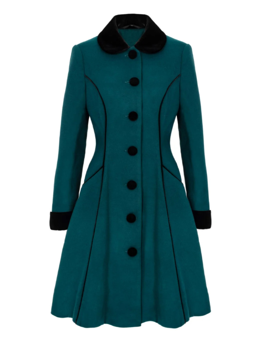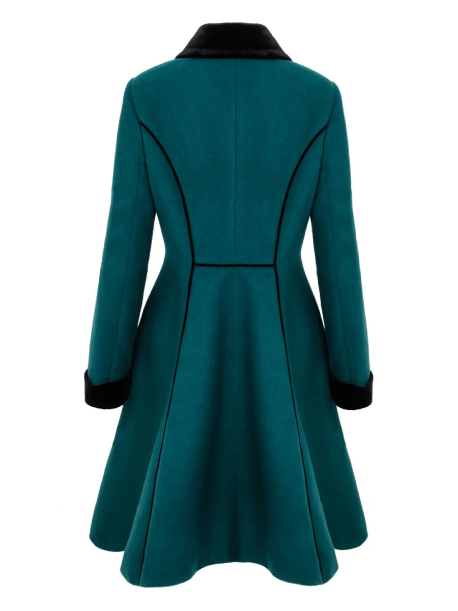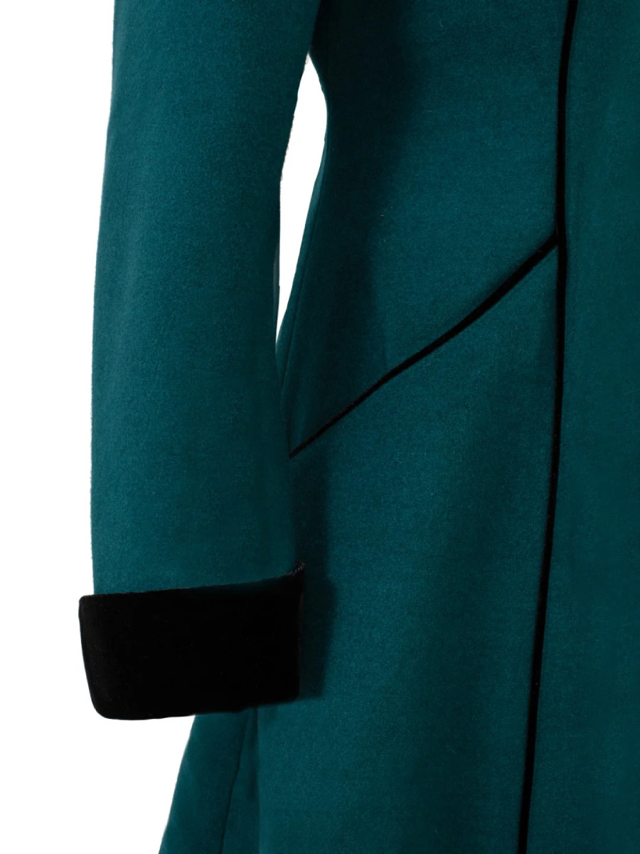 Taillierter dunkelgrüner Mantel im Vintage-Stil mit schwarzem Samtbesatz