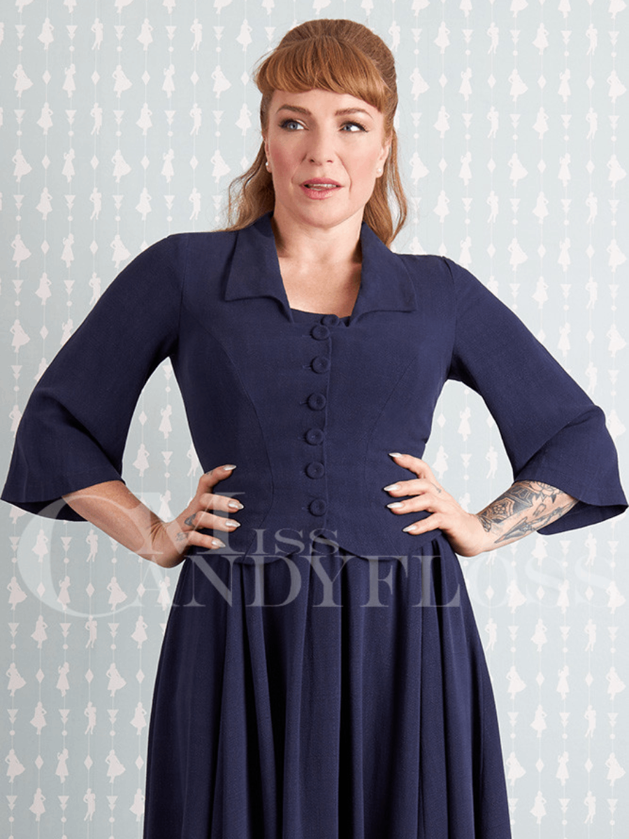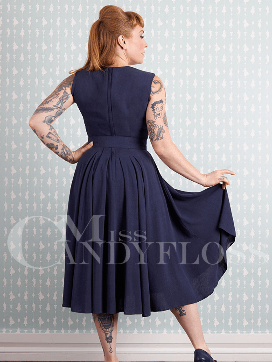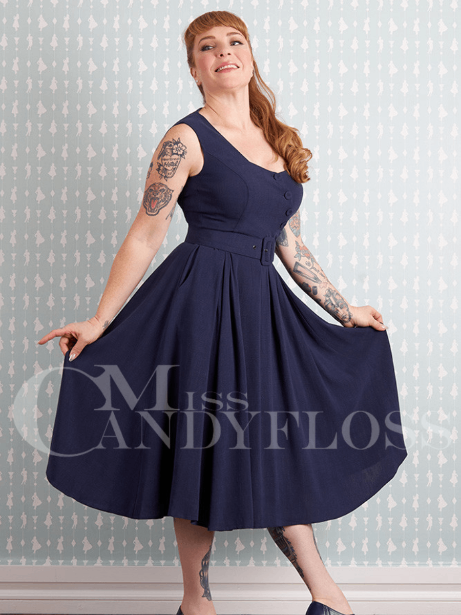 Sommerfrische an der See - da muss das Kleid elegant und bequem sein! Diese dunkelblaue 50er Jahre Swingkleid "Raula-Indigo" von Miss Candyfloss aus der "Cherie Bardot" Kollektion sorgt mit seiner asymmetrischen Knopfleiste am Oberteil für einen ganz besonderen Hingucker. Das ärmellose Sommerkleid aus luftigem Viskose-Leinen-Mix hat ein figurbetontes Oberteil im Stil der 1950er Jahre, dazu passend der weit schwingende Rock, der ganz modern zwei praktische Taschen versteckt. Zusätzlicher Reißverschluss im Rücken, passender Stoffgürtel. Ein edler Traum für lange Spaziergänge am Meer - an kühlen Sommerabenden kombinieren Sie das Kleid einfach mit dem passenden Blazer Lamia-Indigo (nicht im Lieferumfang enthalten) und halten so einer s-teiferen Brise stand. Ein perfekter Look für sommerliche Gartenparties und andere festliche Anlässe.