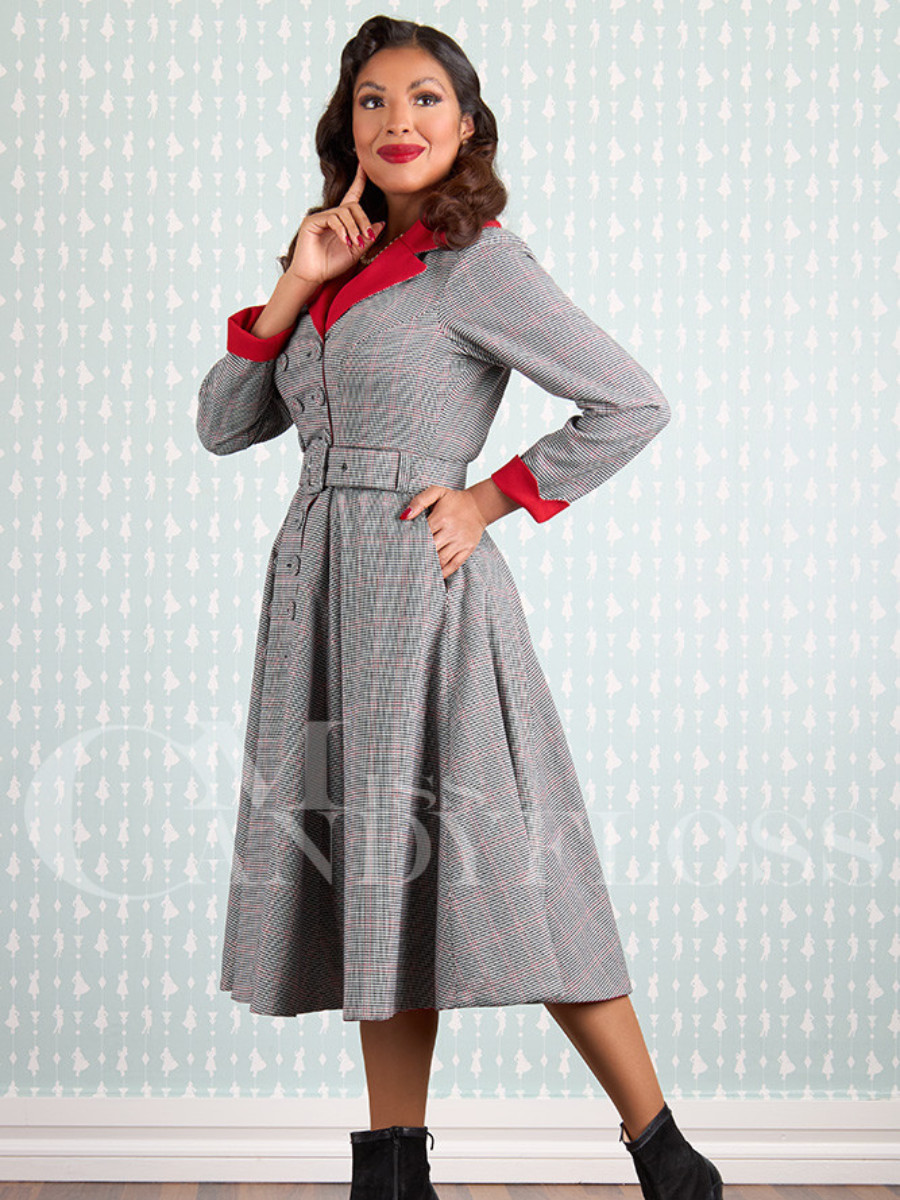 Typisch für die Mode der 50er Jahre hat dieses elegante Swingkleid einen schmeichelhaften V-Ausschnitt mit klassischem Kragen und ein figurbetontes Oberteil. Die langen Ärmel haben kleine V-förmige Schlitze, durch die die jeweils andere Farbe durchblitzt. Das Mantelkleid im 50er Jahre Stil wird vorne durchgeknöpft mit einer doppelreihigen Knopfleiste, die Taille betont ein passender karierter Gürtel. Der Rock ist in A-Linie ausgestellt, natürlich mit Taschen und macht so auch abseits der Fifth Avenue eine gute Figur. Tragen Sie vollendeten Mrs. Maisel Style ganz individuell als Kleid oder als Mantel über einer schmalen Hose im 50er Jahre Stil oder einem Pencil Skirt und werden Sie so selbst zur Stilikone!