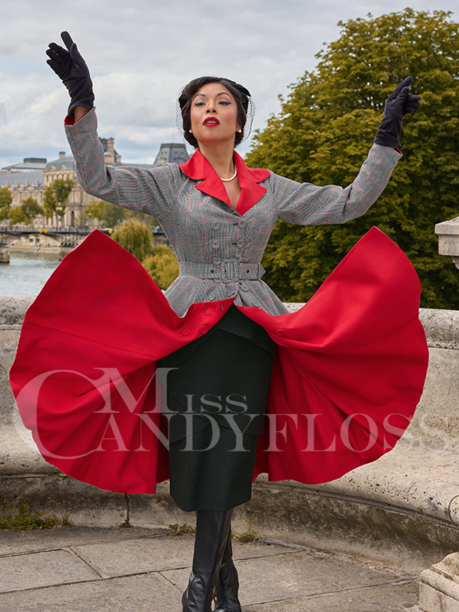 Einmal in Mrs. Maisels Kleiderschrank hüpfen - wäre das nicht Ihr Traum? Mit diesem eleganten Mantelkleid im 50er Jahre Stil "Lilou-Rose Reversible Coat Dress" von Miss Candyfloss schlendern Sie so mondän durch die Straßen wie 50er Jahre Stilikone Midge Maisel. Und wo sonst erhalten Sie 4 Kleidungsstücke zum Preis von einem? Jawohl, dieses vielseitige Mantelkleid im 50er Jahre Stil lässt sich als Swingkleid oder als leichter Mantel tragen, und das je nach Laune in klassischem Karo oder leuchtendem Rot. Die Außenseite ist schwarz-weiß-rot kariert mit rotem Kragen, innen (oder außen) ist dieses traumhafte 50er Jahre Kleid einfarbig rot mit karierten Details.