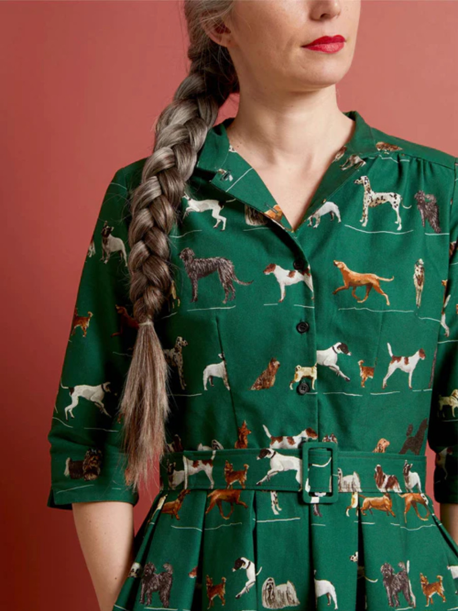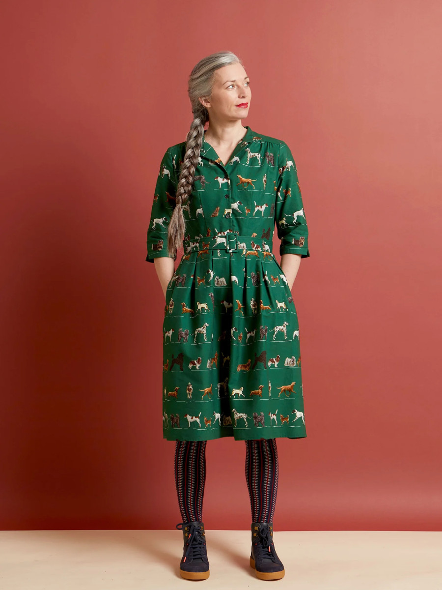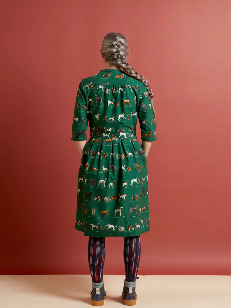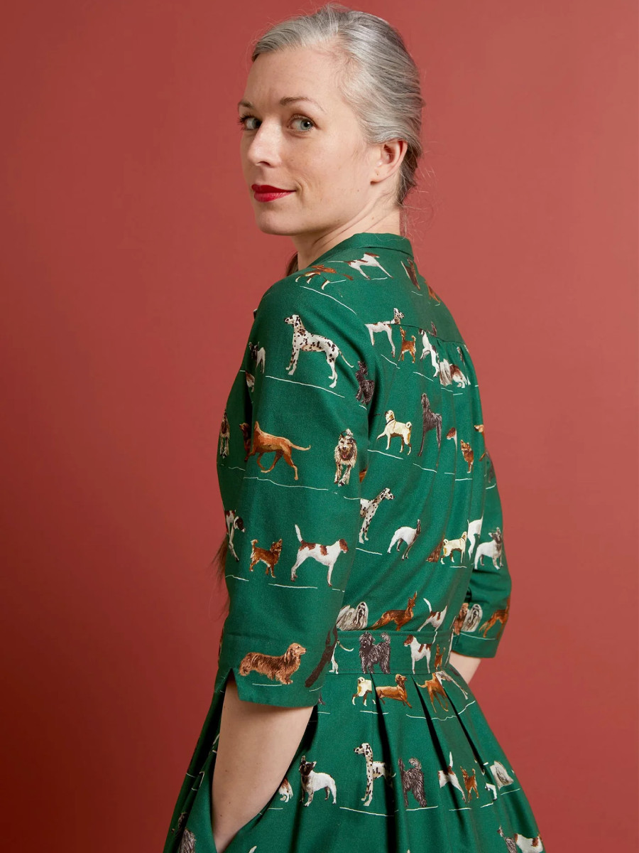Dunkelgrünes Hemdblusenkleid im Vintage-Stil mit Hunde-Print aus Bio-Baumwelle