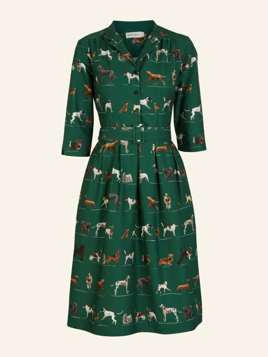 Sie haben bestimmt schon oft "Wow" zu einem schönen Kleid gesagt - aber haben Sie schon einmal "Wau" gesagt? Sie werden dieses originelle Vintage-Kleid "Cynthia Dress Green Porcelain Dogs" von Palava lieben, wenn Sie Hundeliebhaberin sind oder es gerne "very British" mögen. Auf dem klassischen dunkelgrünen Hemdblusenkleid im Vintage Stil tummeln sich Hunde aller Größen, vom Dackel bis zum Dalmatiner. Dieser ganz besondere Print wurde exklusiv von Designerin Bryony für ihr eigenes Label Palava entworfen.