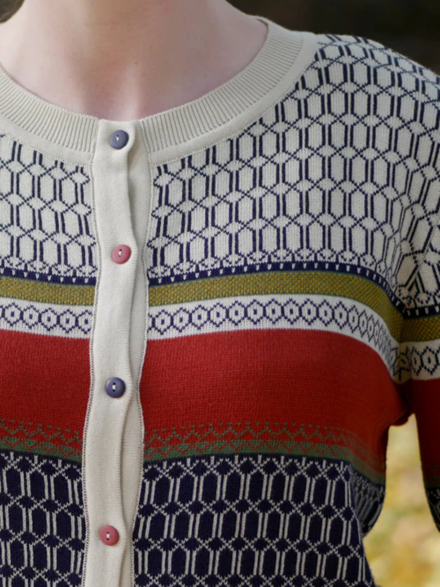 Damen-Cardigan im Vintage-Stil mit geometrischem Fair Isle Strickmuster aus Bio-Baumwolle
