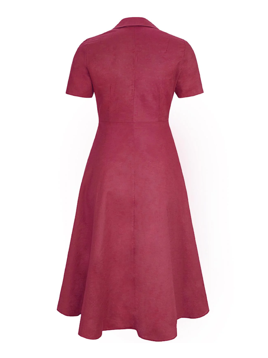 Ein wunderbar authentisches Hemdblusenkleid im 40er Jahre Stil, das bequem und lässig in den modernen Alltag passt: "Melody Shirtwaist Dress Berry Red" von Revival Vintage aus leichtem Baumwoll-Leinen-Mix ist nach historischem Vorbild gearbeitet, und das zeigt sich in den Details. Klassischer Hemdblusenschnitt mit V-Ausschnitt und spitzem Hemdkragen, ein besonderer Hingucker ist der schräg geschnittene Chevron-Effekt an der Schulterpasse und die drei auffälligen Knöpfe im Vintage-Stil vorn. Senkrechte Abnäher am Oberteil sorgen für einen guten Sitz, der ausgestellte Rock hat zwei praktische schräge Taschen vorn. Seitlicher Reißverschluss. Sehr angenehmes, leichtes Material, perfekt für sonnige Sommertage - da das Kleid leicht transparent ist, empfehlen wir ein Unterkleid.