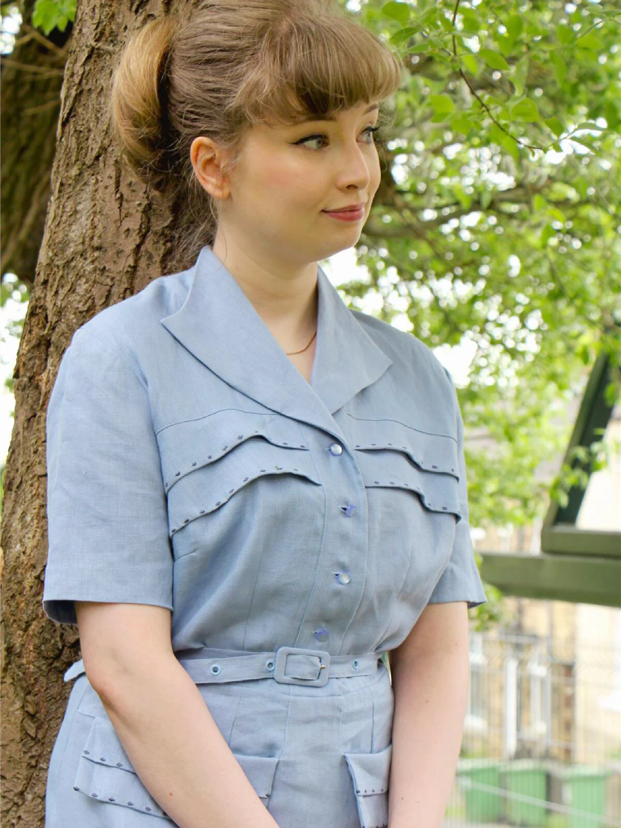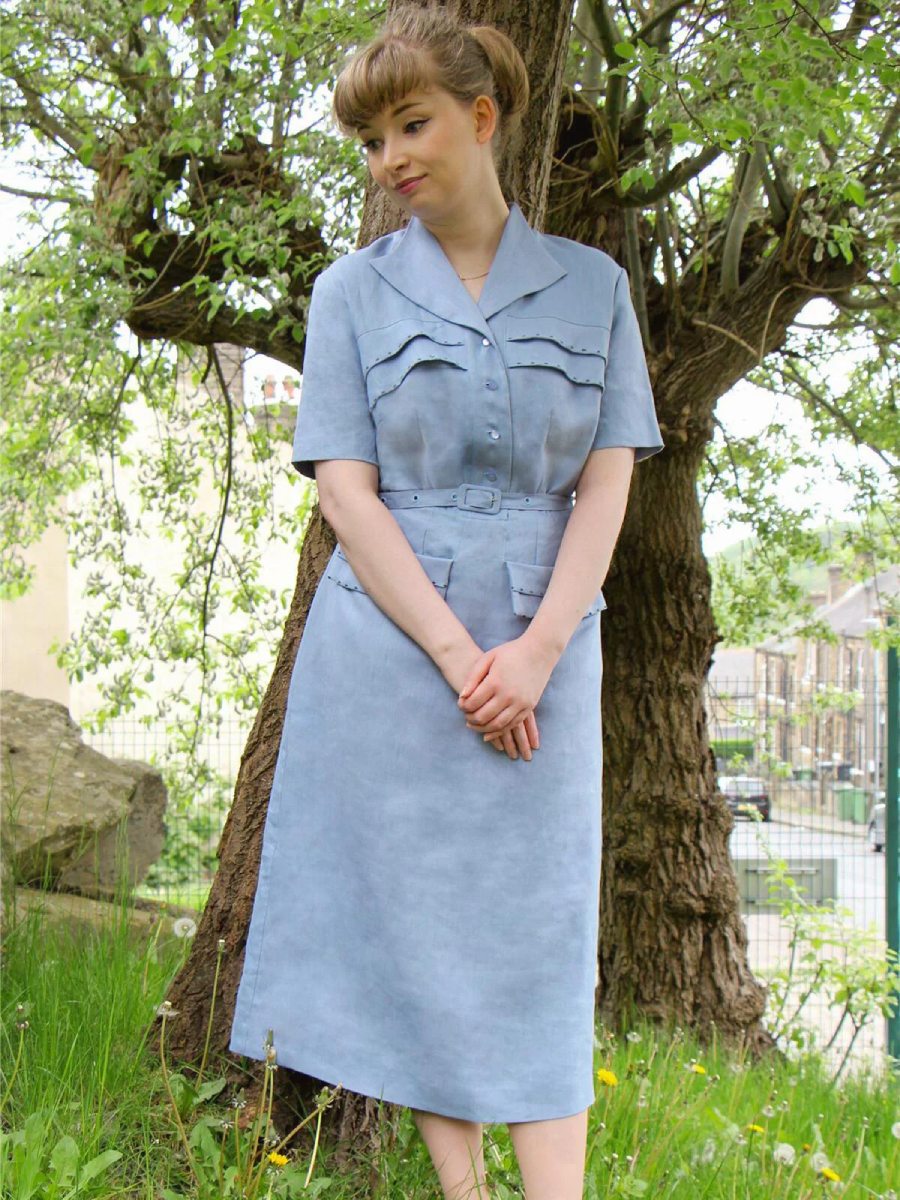 Dieses wunderbar authentische Midikleid im 40er Jahre Stil versetzt uns direkt in die Welt von "Miss Marple" oder "Call the Midwife": "Spirit Linen Dress Cornflower Blue" von Revival Vintage aus ein schmal geschnittendes Kleid nach historischem Vorbild gearbeitet mit viel Liebe zum Detail. Klassischer Hemdblusenschnitt am Oberteil mit großem spitzen Kragen, vier Perlknöpfen vorn und wellenförmigem Zierbesatz über der Brust. Senkrechte Abnäher über der Taille sorgen für die typische Forties-Silhouette. Schmal geschnittener Rock mit zwei Taschen, die ebenfalls mit einer Wellenkante besetzt sind - die Kellerfalte hinten im Rock sorgt für Bewegungsfreiheit, ein passender Stoffgürtel betont die Taille. Seitlicher Reißverschluss. Sehr angenehmes, leichtes Material, perfekt für den Sommer.