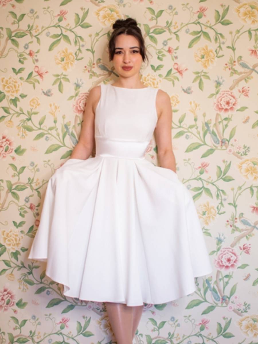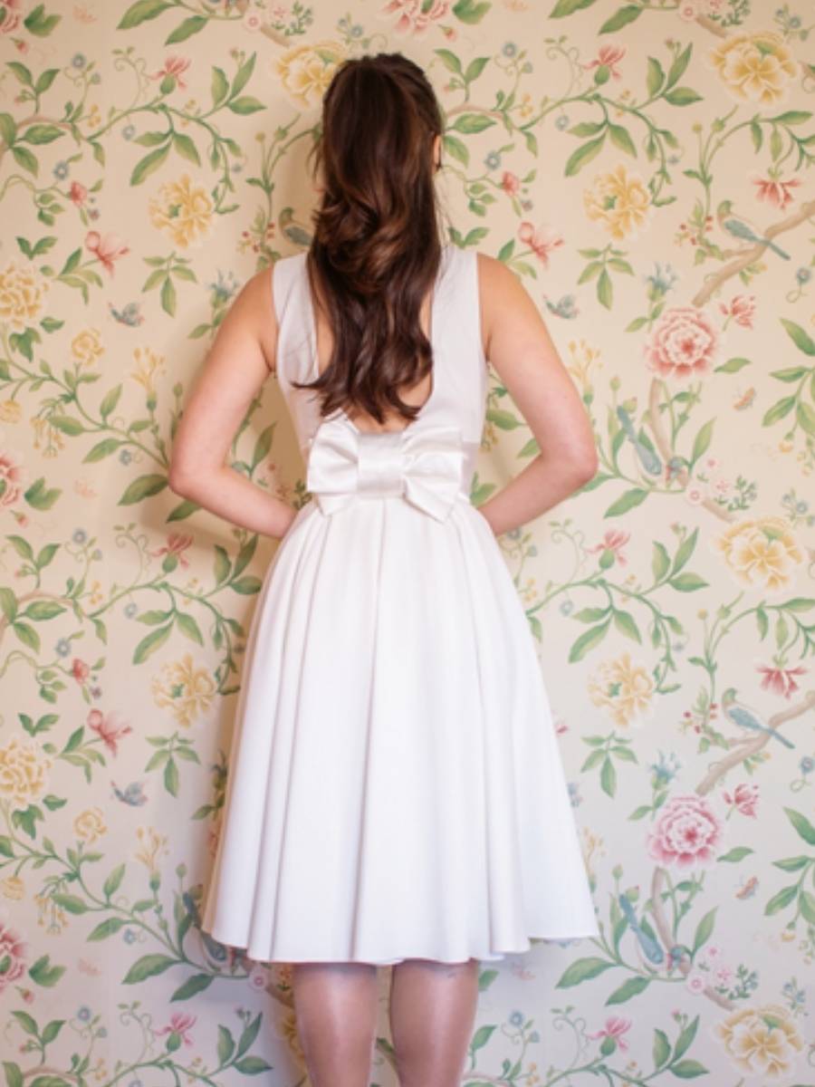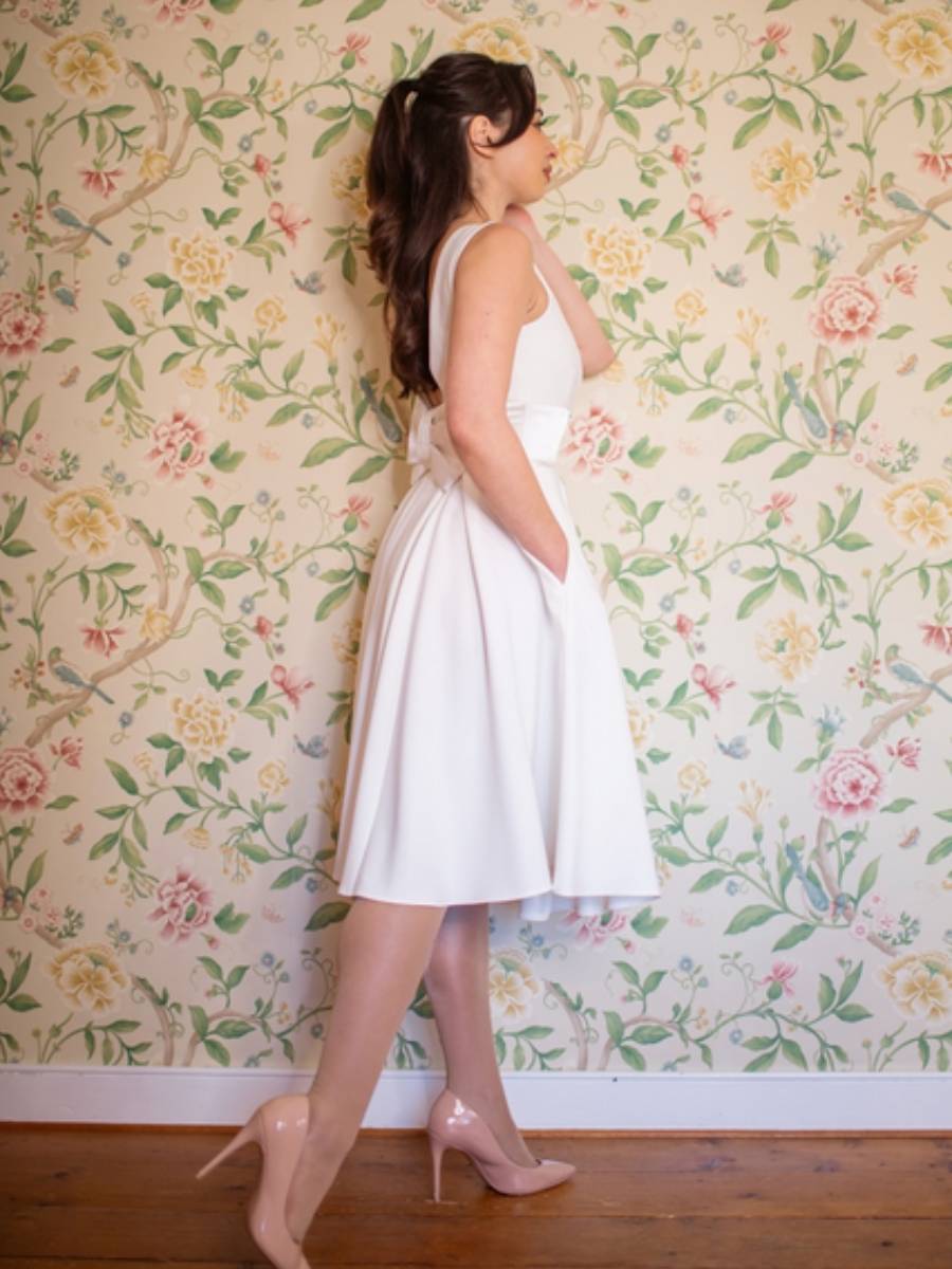 Heiraten wie Audrey Hepburn ... dieses wunderschöne cremefarbene Swingkleid im 50er Jahre Stil "Riviera Swing Dress Ivory" von The Pretty Dress Company ist genau richtig, um sich wie ein Hollywood-Star der 50er Jahre zu fühlen! Das elegante Kleid ist vorne hochgeschlossen mit weitem runden Ausschnitt und verrät sein Geheimnis auf der Rückseite - zum entzückenden tiefen Rückenausschnitt gesellt sich eine verspielte große Schleife. Abnäher am figurbetonten Oberteil und das 8,5 cm breite Taillenband aus Satin machen eine traumhafte Figur, der weite Rock schwingt dank Kellerfalten mit und ohne Petticoat. Und, liebe Bräute, das Kleid hat sogar Taschen! Dieses traumhafte Vintage-Modell ist innen gefüttert und wird mit einem seitlichen Reißverschluss geschlossen. Sehr hochwertige Verarbeitung, genau richtig für den großen Tag!
