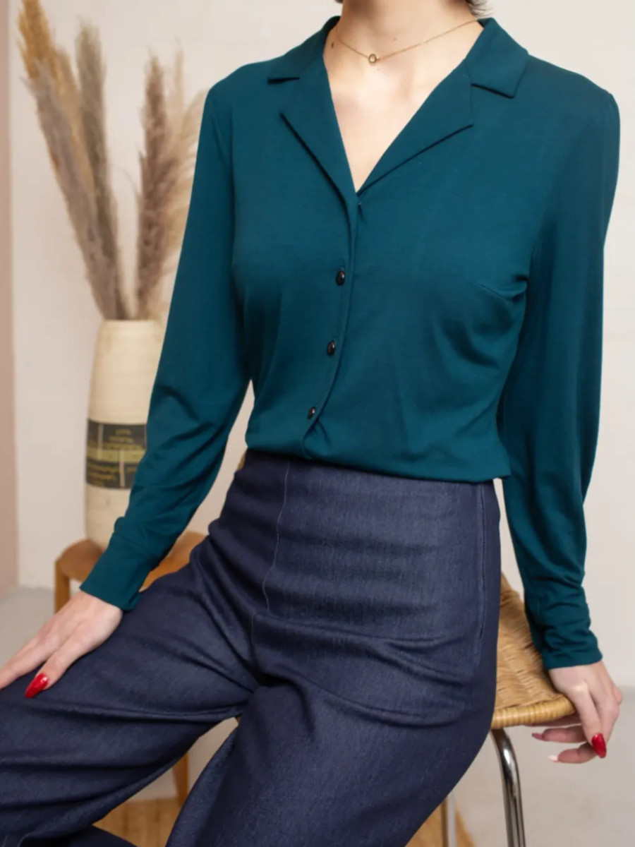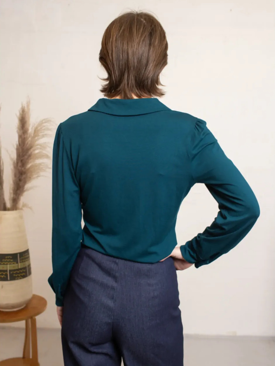 - Damenbluse aus petrolfarbenem Viskose-Jersey (Eco Vero) im Vintage-Stil