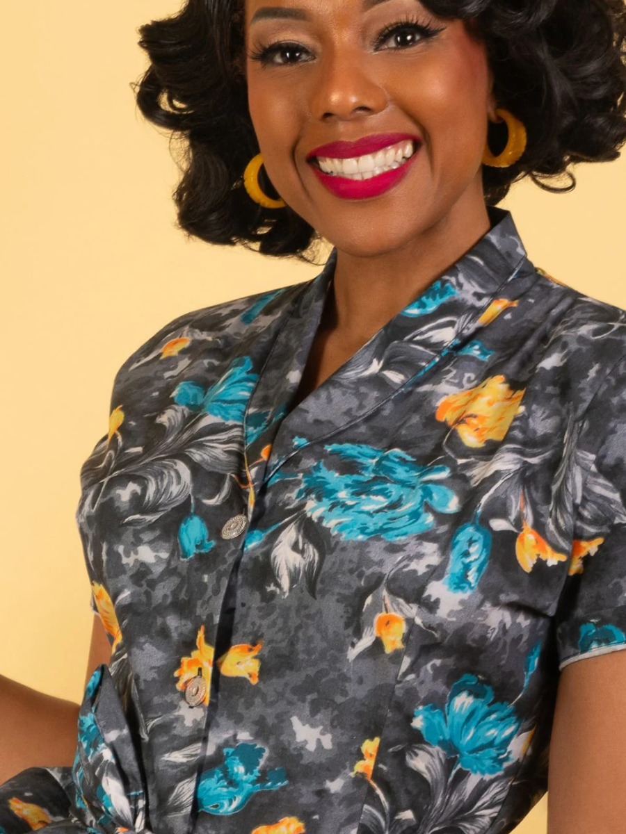 Es könnte ein Vintage-Original sein: "Lucy Retro Grey Dress with Floral Print" von What Katie Did ist ein wunderschönes Hemdblusenkleid in einem traumhaften floralen Print, inspiriert von den Originalen der Fünfziger. Typischer 50er Jahre Schnitt mit V-Ausschnitt und spitz zulaufendem Kragen, kurze Ärmel mit Ärmelaufschlägen, weit schwingender Rock mit versteckten seitlichen Eingrifftaschen. Das Kleid wird durchgehend vorne geknöpft, die eleganten Glasknöpfe sind Vintage-Originale. Ein passender Bindegürtel aus Stoff betont die Taille. Das Material ist ein hochwertiger Baumwollstoff, sehr angenehm zu tragen.