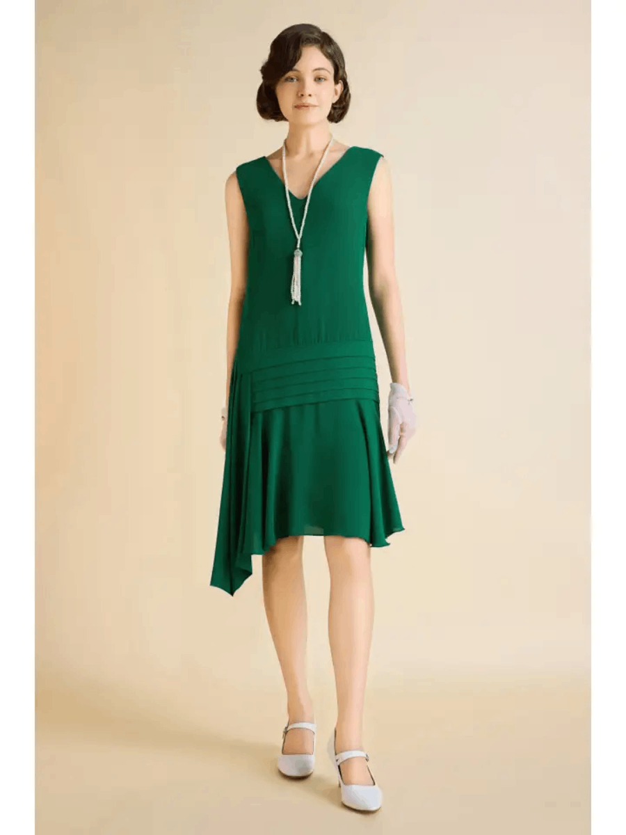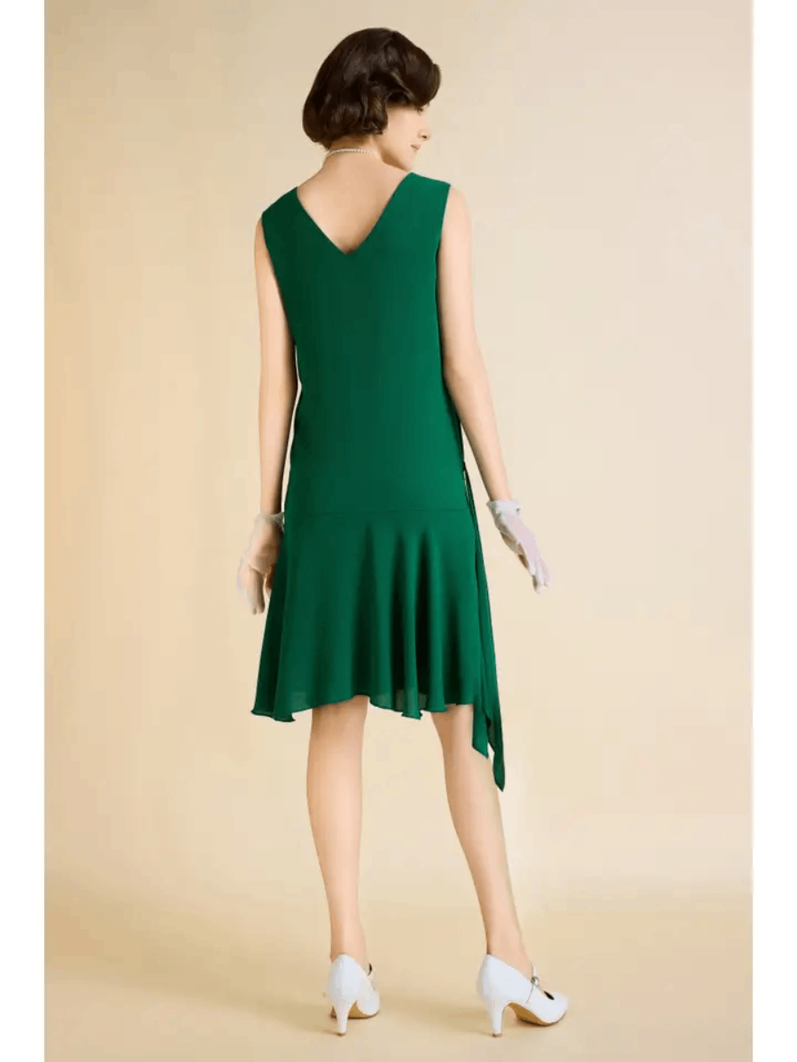 20er Jahre Look ganz fließend und zart: Dunkelgrünes Flapper-Kleid "Vintage Irregular Ribbon Pleated Day Dress" aus fließendem Chiffon, ganz im Stil der Tageskleider der 1920er Jahre. Das ärmellose Kleid hat einen tiefen V-Ausschnitt vorne und hinten und die zeittypische tiefe Taille, die von einer Reihe schmeichelnder Volants betont wird. Der Saum ist ganz originalgetreu leicht zipfelig geschnitten. Ebenfalls ganz stilecht ist der asymmetrische Schnitt mit weich fallender Schärpe auf der rechten Seite. Seitlicher Reißverschluss. Das Kleid hat ein blickdichtes Innenfutter - perfekt für den Sommer. Ein wunderbar leichtes 20er Jahre Kleid für die nächste Gatsby-Gartenparty!