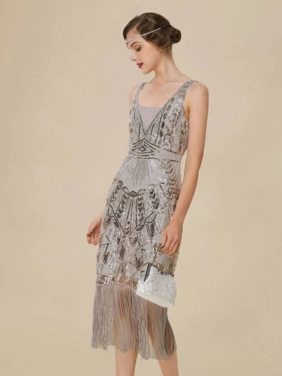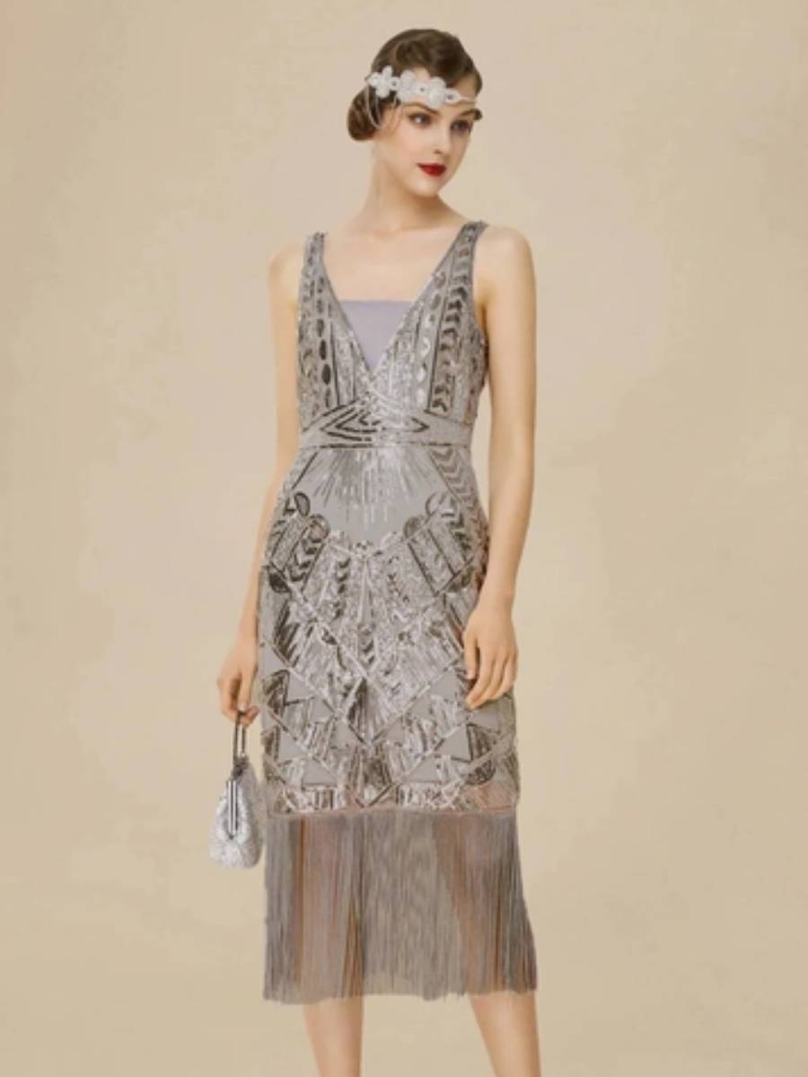- Silbergraues Flapper-Kleid im 20er Jahre Stil