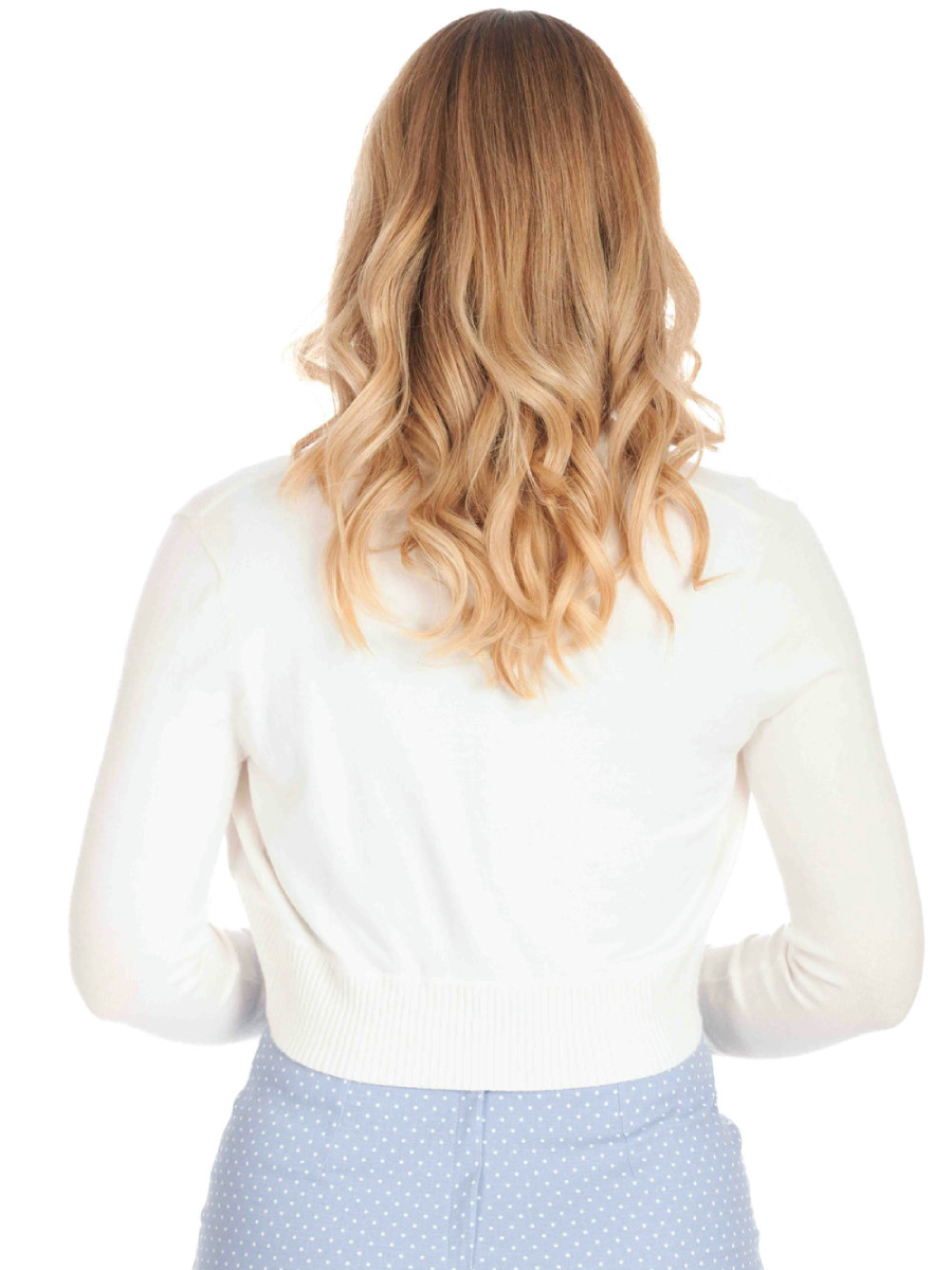 Wenn es an einem kühlen Sommerabend zu warm für eine Jacke, aber zu kalt für ein schulterfreies Kleid ist, kommt dieses kuschlige Bolerojäckchen ins Spiel. Das klassische cremefarbene Strick-Bolero im 50er Jahre Stil "Betty Bolero Off White" von Banned verhüllt liebevoll kalte Schultern und hat die perfekte Länge zu Petticoatkleidern und Swingröcken. Es hat lange Ärmel, die bei Bedarf umgeschlagen werden können. Rippstrick an den Ärmelbündchen und rundherum vom Halsausschnitt zum Bund. Die Lösung für alle Frostbeulen da draußen!