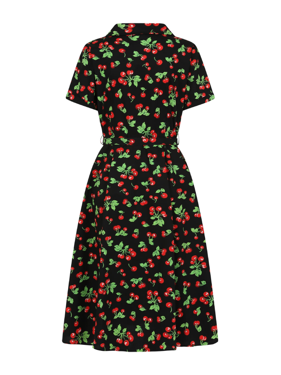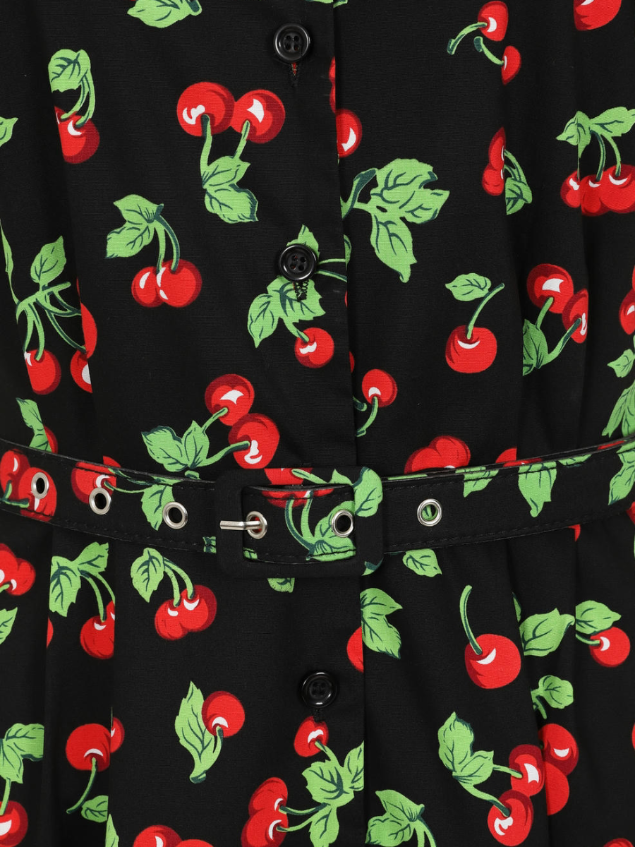 Freches Früchtchen: Schwarzes Hemdblusenkleid im 50er Jahre Stil "Darla Cherries Dress Black" von Banned mit leuchtend rotem Rockabilly-Kirschenprint. Das Kleid hat einen schönen V-Ausschnitt mit klassischem Kragen, kurze Ärmel und wird vorne durchgehend geknöpft. Der Rock ist in A-Linie leicht ausgestellt mit zwei seitlichen Eingrifftaschen. Ein passender stoffüberzogener Kunststoffgürtel betont die Taille. Kein Reißverschluss. Sehr angenehmer Baumwollstoff mit etwas Stretch. Ein wunderschönes Kleid für einen lässigen Rockabilly-Style!