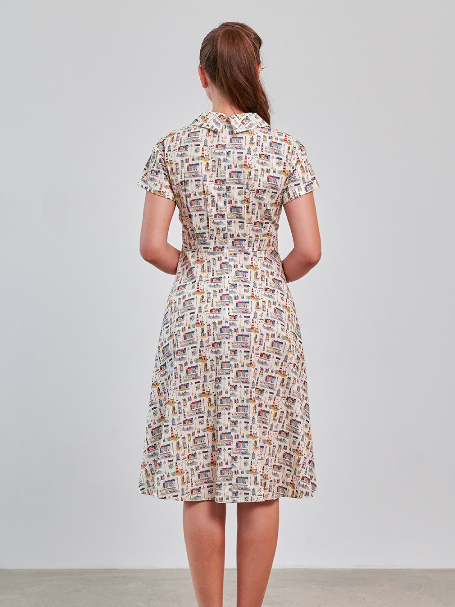 Cremefarbenes A-Linien Kleid im Vintage-Stil der 1940er 1950er Jahre mit maritimem Print und Schleife