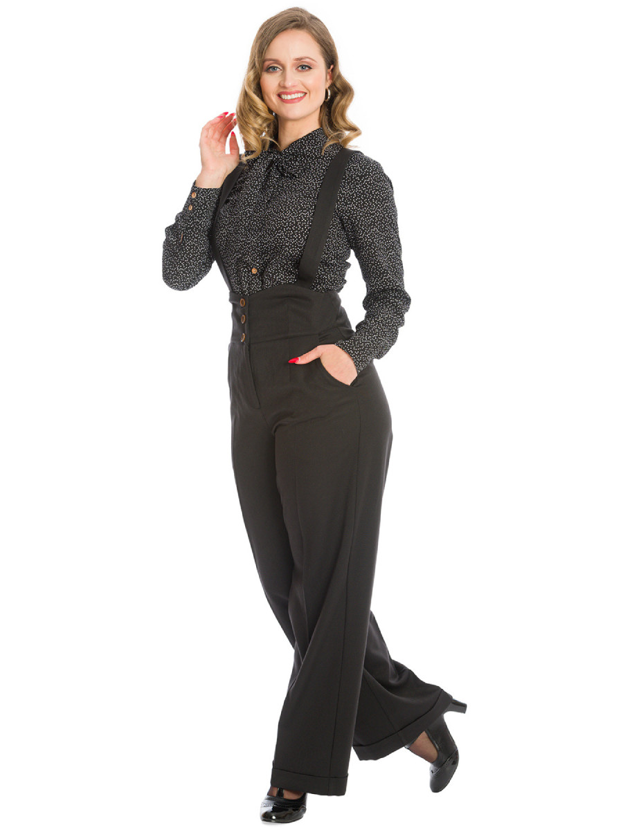 Warum diese Hose "Her Favourites" heißt? Ganz einfach, weil sie Ihre neue Lieblingshose werden wird! Die schwarze Marlenehose im Vintage-Stil "Her Favourite Trouser Black" von Banned ist so vielseitig, dass sie für unendlich viele Looks im Stil der 1920er, 1930er und 1940er passt. Kombinieren Sie diese Hose im Businesslook mit einer Damen-Weste im androgynen Stil oder für abends elegant mit einer Vintage-Bluse. Die weit geschnittene High Waist Hose ist mit ihrem extra-hohen Taillenbund so clever geschnitten, dass sie eine super-schmale Taille macht. Der besondere Clou sind die verstellbaren Hosenträger, die diese Marlenehose im Vintage-Stil zu einem ganz besonderen Hingucker machen. Profi-Tipp: Tragen Sie die Hosenträger hinten gekreuzt, damit die Träger optimal auf Ihrer Schulter bleiben. Und wenn die Hosenträger mal im Weg sind? Einfach abknöpfen! Die Hosenbeine sind im Marlene-Dietrich-Style weit und gerade geschnitten mit kleinem Aufschlag am Saum. Vorne wird die Hose mit drei braunen Knöpfen im Vintage-Stil und einem Reißverschluss geschlossen. Und wie es sich für eine Hose im leicht androgynen Vintage-Stil gehört, hat sie natürlich Taschen! Wann darf Ihre neue Lieblingshose bei Ihnen einziehen?