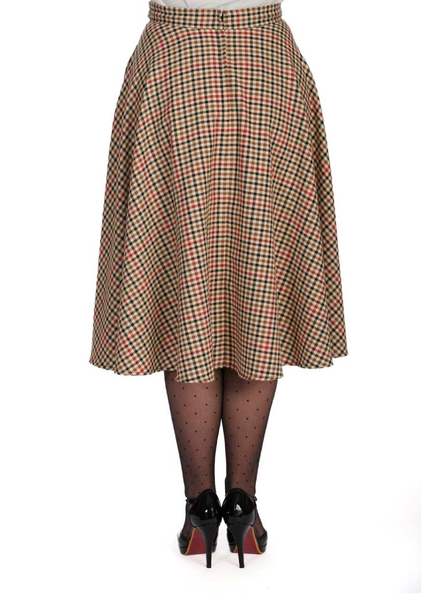 Dieser Klassiker ist immer in Mode: Beige-braun-rot karierter Tellerrock "Hilda Check Swing Skirt" von Banned im 50er Jahre Vintage Stil. Der Rock hat ein 4 cm breites Taillenband und wird hinten mit einem Reißerschluss geschlossen. Zwei verdeckte seitliche Eingrifftaschen machen diesen Rock zu einem perfekten Alltagsbegleiter. Die zwei dekorativen Querriegel mit Knöpfen an der Seite sind abnehmbar.