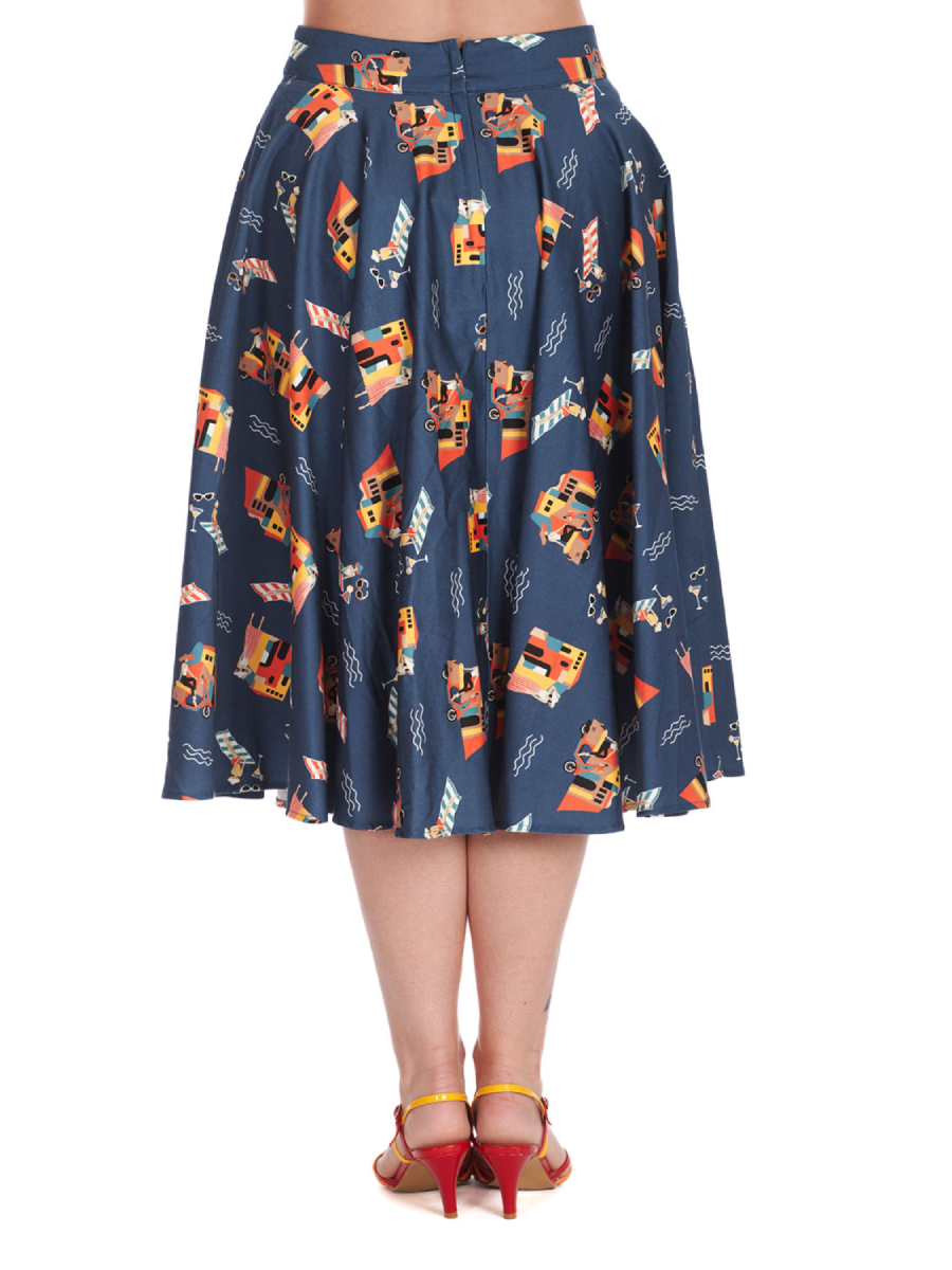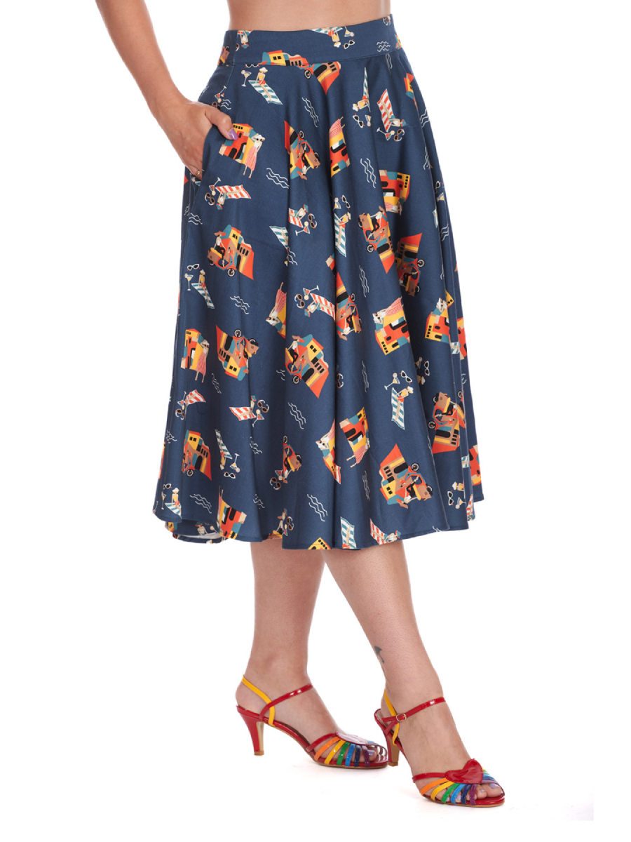 Sommer, Sonne, Urlaubsfeeling! Dieser dunkelblaue Rock "Portofino Living Swing Skirt" von Banned macht Lust auf einen Sommer in Italien. Toller weit schwingender Rock mit Urlaubsprint im 50er Jahre Stil - inklusive Strand-Szenen, Motorroller und flanierenden Vintage-Ladies! Der Rock hat einen 5 cm breiten Taillenbund und wird hinten mit einem Reißverschluss und einem Häkchen geschlossen, er sieht mit oder ohne Petticoat toll aus. Zwei versteckte seitliche Eingrifftaschen im Rock. Ein traumhafter Pinup-Rock für heiße Tage!
