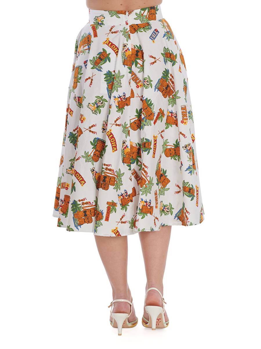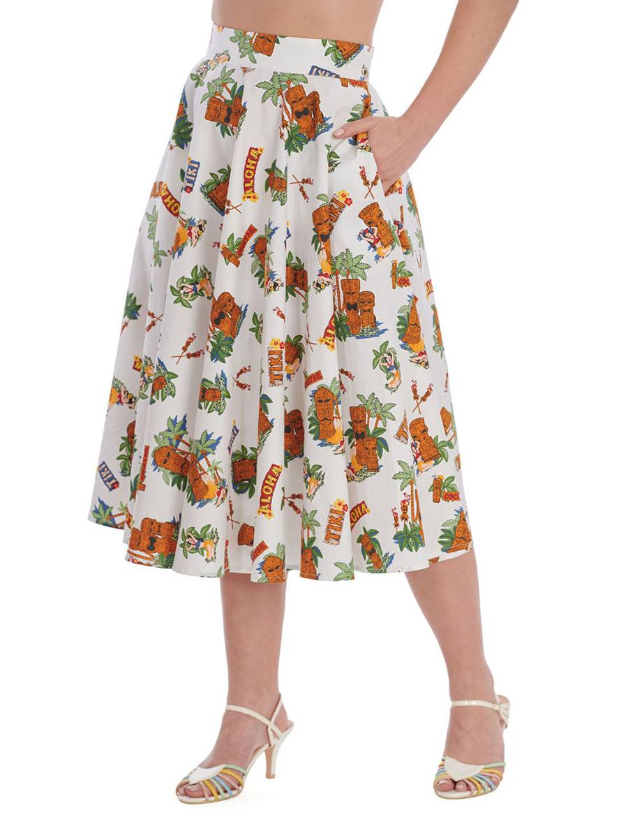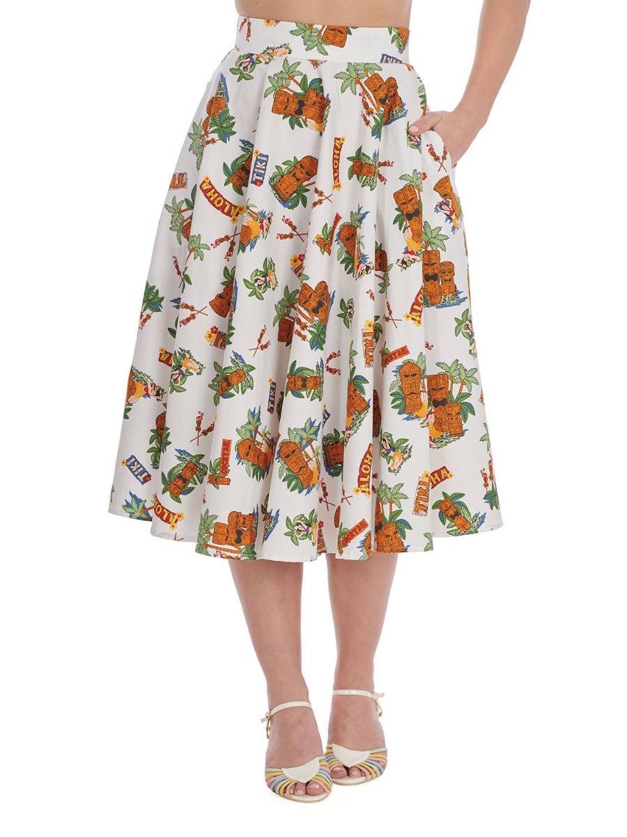 Aloha from Hawaii: Wunderschöner weißer Sommerrock im 50er Jahre Stil "Tiki Club Swing Skirt" von Banned in einem fröhlichen Tiki-Print mit Tikis, Hawaii-Girls und Blumen. Toller weit schwingender Rock mit 4,5 cm breitem Taillenbund und versteckten seitlichen Eingrifftaschen. Reißverschluss hinten. Der Rock kann mit oder ohne Petticoat getragen werden, der leichte Baumwollstoff ist perfekt für Sommer und Urlaub.