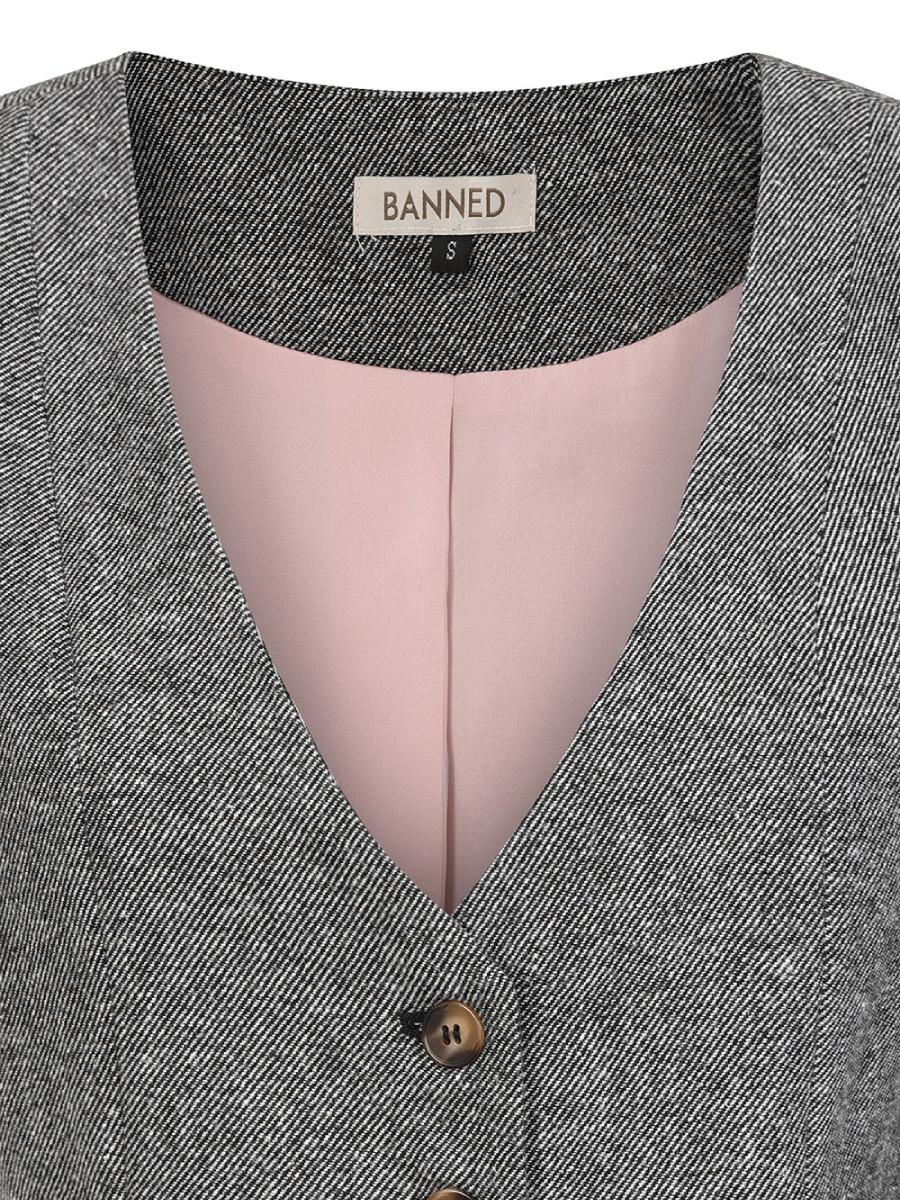 Herren-Stil ja, aber für Sie ist es immer wichtig, dabei Ihre Weiblichkeit zu zeigen. Die elegante Damen-Anzugweste im Vintage Stil "Selma Herringbone Waistcoat Grey" von Banned hat das Beste aus beiden Welten. Sie ist aus grauem Wollgemisch in Tweed-Optik, wie es die feinen britischen Herrenschneider so lieben, aber der Schnitt ist für die weibliche Figur optimiert und passt wunderbar zur Marlenehose, einem Swingrock im 40er Jahre Stil oder einem engen Fishtail-Rock im Look der 20er und 30er. Klassische Westenform mit tiefem V-Ausschnitt und 4 Knöpfen vorn. Der Querriegel mit Knöpfen hinten ist wieder an den echten Gentleman-Look angelehnt. Diese wunderbar klassische Anzugweste für Damen ist nicht nur beim Five o`clock Tea ein absoluter Hingucker!