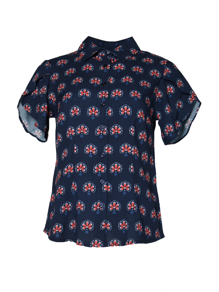 Lässiger Sixties-Style: Dunkelblaue Hemdbluse "Peacock" von Circus aus Ecoliva-Viskose mit kurzen Tulpenärmeln und einem fröhlichen abstrakten Print im 60er Jahre Stil. Die locker geschnittene Bluse ist hochgeschlossen mit kleinem Hemdkragen und wird vorne mit dunkelblauen Knöpfen durchgeknöpft. Perfekt zu High Waist Jeans für einen lässigen Mod-Look!