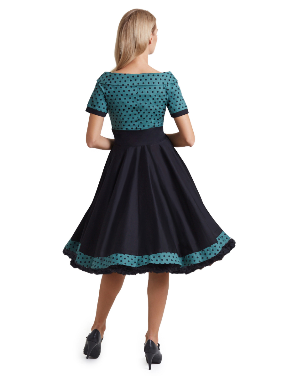 Rockabilly-Style in Dunkelgrün: Petticoatkleid "Darlene Full Circle Green and Black Polka Dot Swing Dress" von Dolly & Dotty mit weitem U-Boot-Ausschnitt, dunkelgrünem Oberteil mit schwarzen Polkadots, kurzen Ärmeln und weit schwingendem schwarzen Rock. Der Polkadot-Stoff vom Oberteil wiederholt sich unten am Saum. Das Oberteil ist schön auf Figur geschnitten mit einem 8,5 cm breiten schwarzen Taillenband, schwarze Zierpaspeln zieren die Ärmel. Seitlicher Reißverschluss. Zwei süße schwarze Zierknöpfe am Kragen.