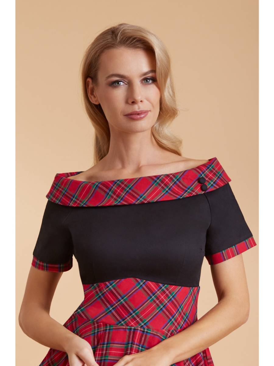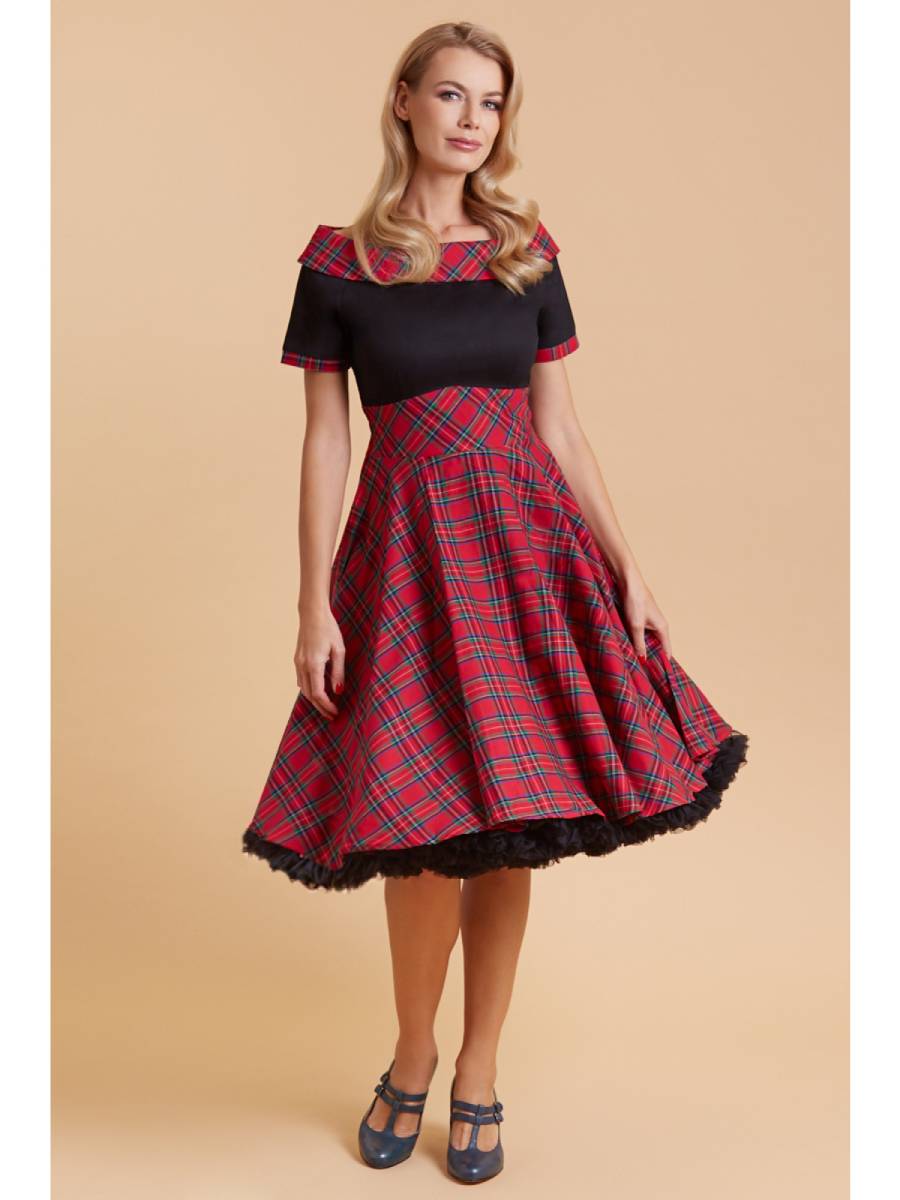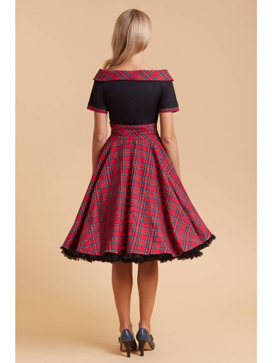 Klassisches Schottenkaro: Rot kariertes Petticoatkleid "Darlene Red Tartan Swing Dress" von Dolly & Dotty mit weitem U-Boot-Ausschnitt und schwarzem Oberteil. Das Kleid hat kurze Ärmel und einen weit schwingendem Rock. Das Oberteil ist schön auf Figur geschnitten mit einem 8,5 cm breiten schwarzen Taillenband, Kragen und Ärmelbündchen sind aus dem gleichen Schottenkaro-Stoff wie der Rock. Seitlicher Reißverschluss. Zwei süße schwarze Zierknöpfe am Kragen.