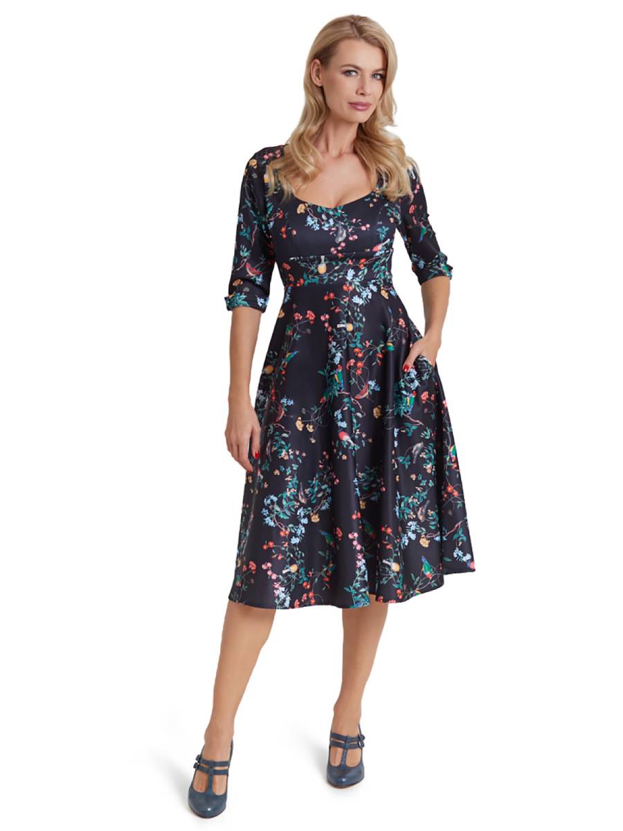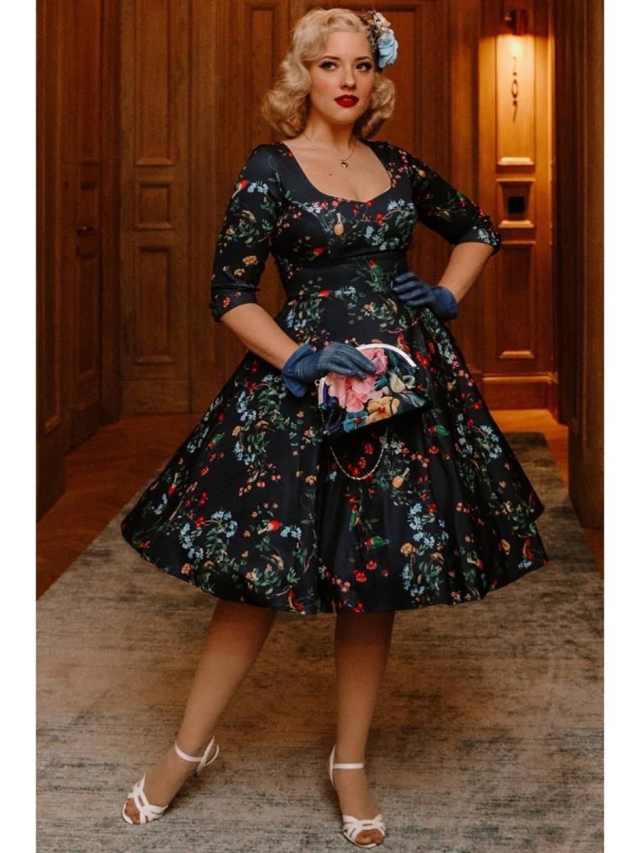 Ein Kleid wie ein Märchenwald: Romantisches Swing-Kleid im 50er Jahre Stil "Debra Long-Sleeved Stretchy Dress Black Birds & Flowers" von Dolly & Dotty in einem wunderschönen Print mit Blumen und Vögeln auf schwarzem Hintergrund. Das Kleid im Vintage-Stil hat elegante 3/4 Ärmel mit Ärmelaufschlägen und einen tollen Herzausschnitt, der das Dekolleté perfekt in Szene setzt. Figurbetontes Oberteil mit Abnähern vorn, das 8 cm breite Taillenband sorgt für eine schöne Pinup-Taille. Weit schwingender Rock mit 2 versteckten Eingrifftaschen. Zierknöpfe an den Ärmelbündchen, Reißverschluss im Rücken. Sehr hochwertiges, elastisches Material mit leichtem Glanzeffekt.
