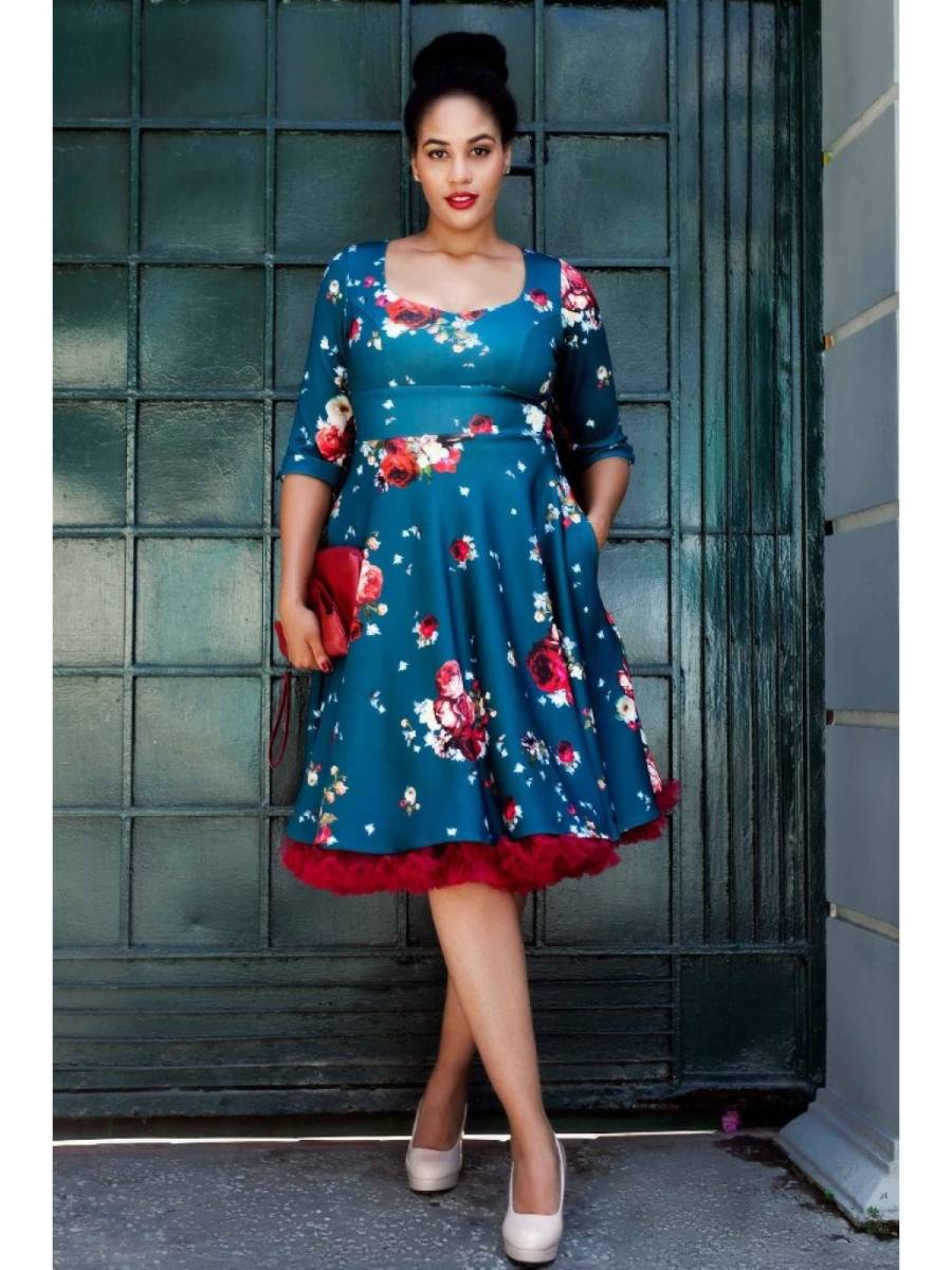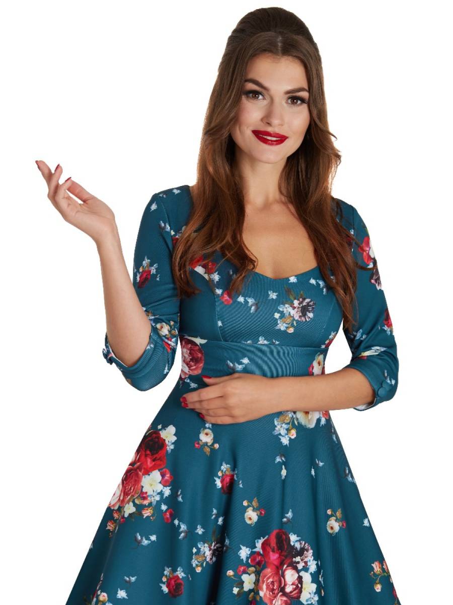 Rosen-Romantik in großen Größen: Blaues Swing-Kleid im 50er Jahre Stil "Scarlette Long-Sleeved Blue Rose Print Stretchy Dress" von Dolly & Dotty mit zauberhaftem Rosen-Print. Das Kleid im Vintage-Stil hat elegante 3/4 Ärmel mit Ärmelaufschlägen und einen tollen Herzausschnitt, der das Dekolleté perfekt in Szene setzt. Figurbetontes Oberteil mit Abnähern vorn, das 8 cm breite Taillenband sorgt für eine schöne Pinup-Taille. Weit schwingender Rock mit 2 versteckten Eingrifftaschen. Zierknöpfe an den Ärmelbündchen, Reißverschluss im Rücken. Sehr hochwertiges, elastisches Material mit leichtem Glanzeffekt. Die Farbe changiert leicht ins Petrol.