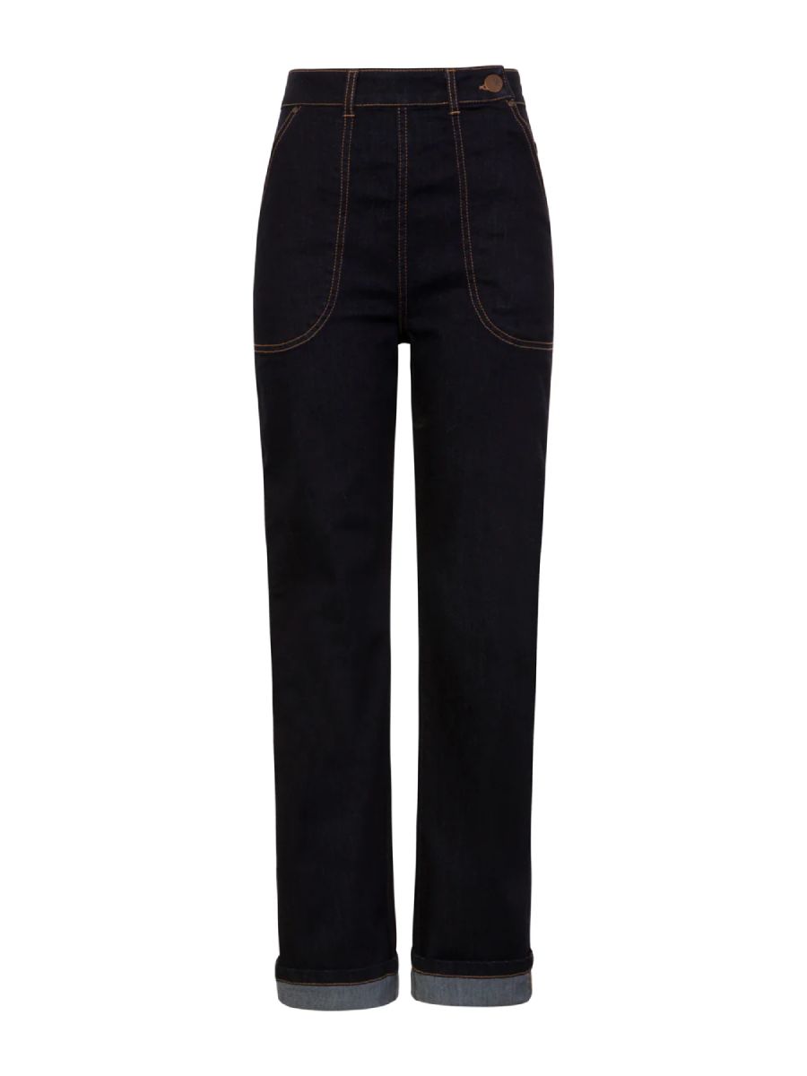 A classic rockabilly style: "Weston Denim Trousers Navy" by Hell Bunny, made from heavy duty dark blue denim with a bit of stretch. High-waisted design with hidden zipper under the front pocket and button on the left-hand side of the waistband. Wide straight legs, two side front pockets and two pockets in back.