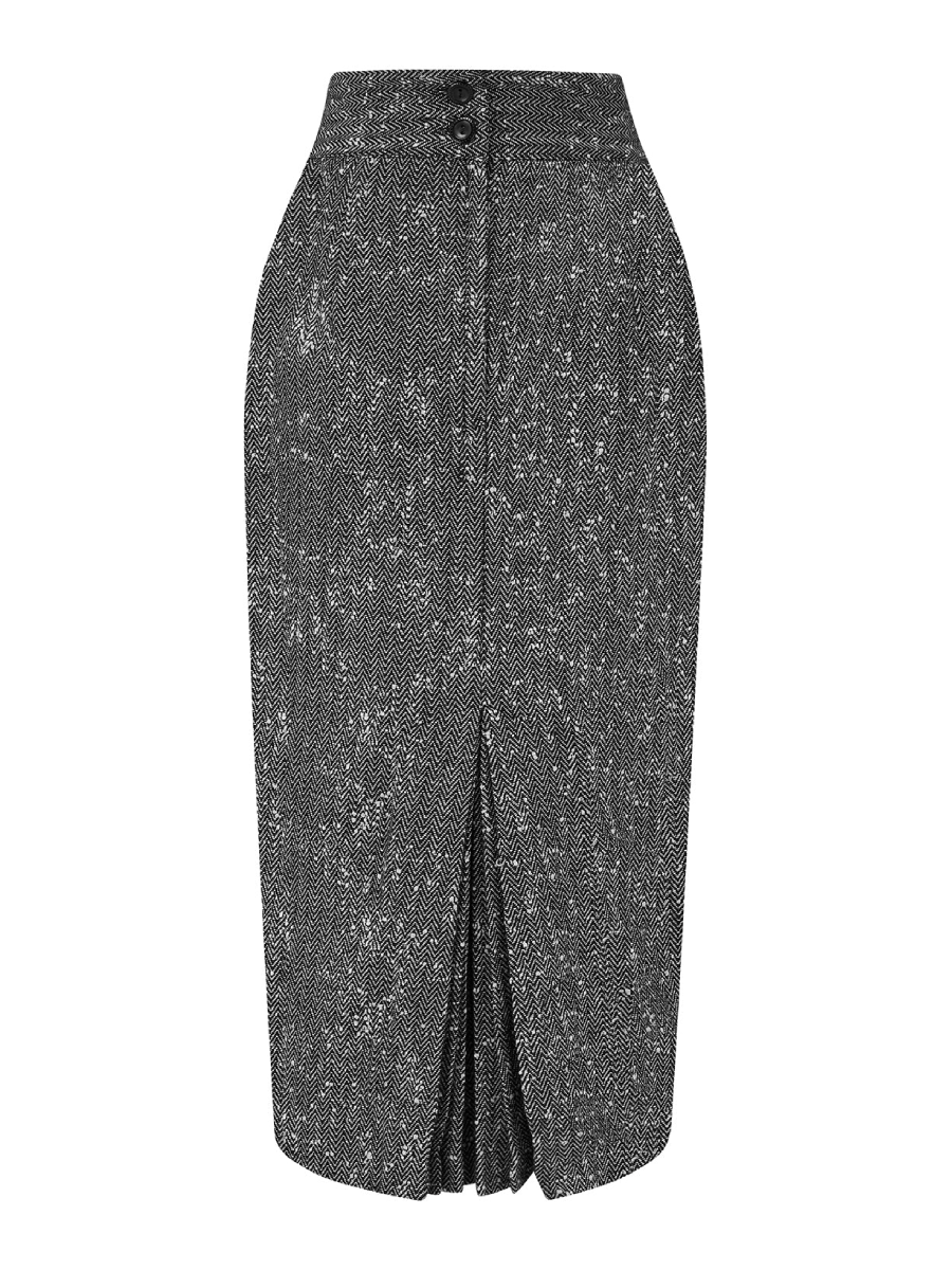 This pencil skirt could be a vintage original, straight out of "Mad Men"! Classic 1950s style pencil skirt "Jitterbug Pencil Skirt with Kick-Pleat in Black & White Herringbone Wool" by Rock'n'Romance, made from traditional black and white herringbone wool fabric flecked with white. This narrow skirt features a 7 cm wide waist band and darts below the waist to perfectly hug your curves at the hip. Kick pleat in back so you can move freely, the skirt closes in back with a zipper and button. Black cotton lining in the top half of the skirt. This pencil skirt is a classic 1950s wardrobe staple, wear it pinup style with a tight 1950s sweater or opt for a vintage style blouse for a ladylike Fifties-inspired business look.