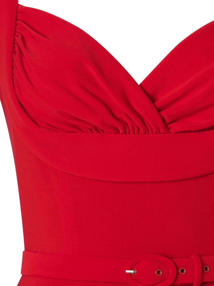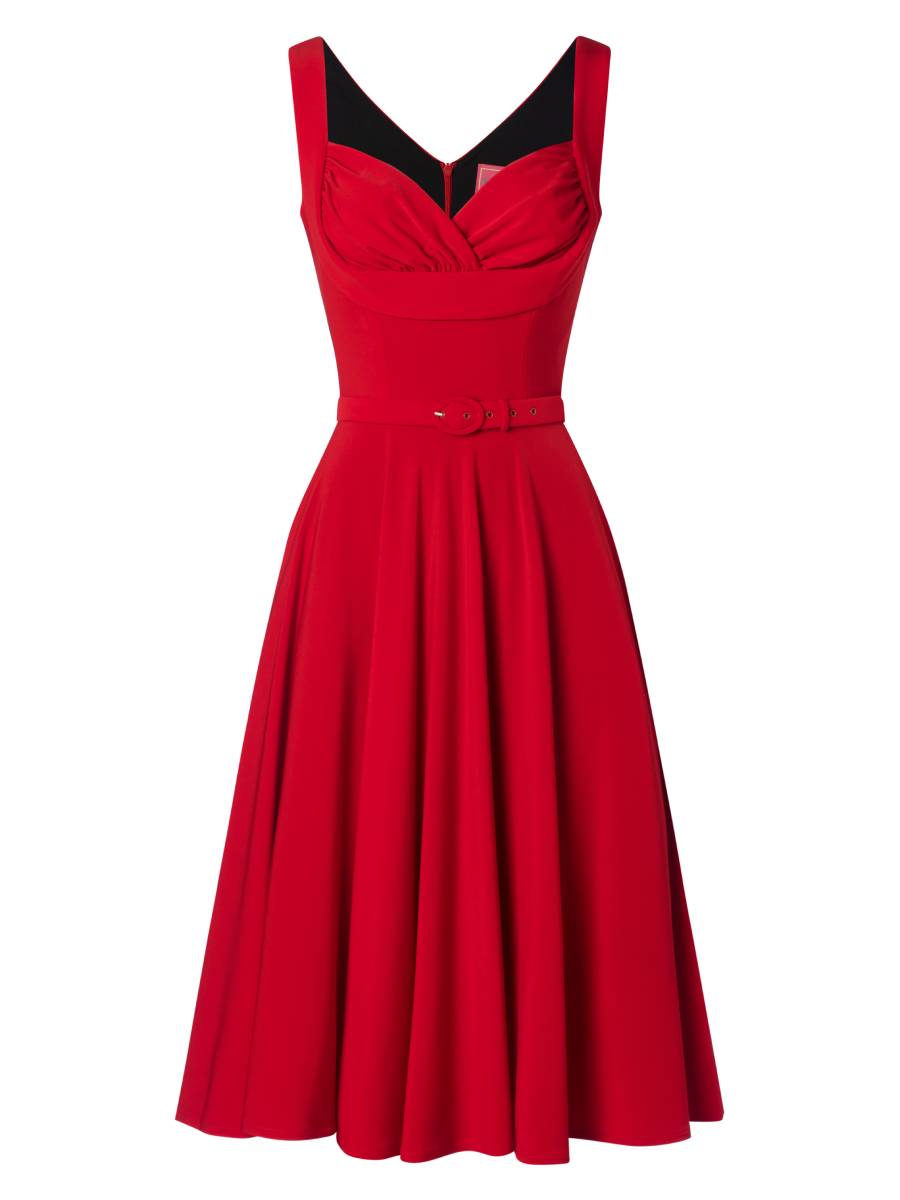Perfekte Marilyn-Vibes: Spektakuläres Kleid im 50er Jahre Stil "Gina Lee Swing Dress Scarlet Red" von Glamour Bunny mit sensationellem Ausschnitt mit Raffung an der Brust und weit schwingendem Rock. Das Oberteil macht durch den dezenten Shaping-Effekt eine perfekte Pinup-Figur, die breiten Träger geben ausreichend Halt. V-Ausschnitt und Reißverschluss im Rücken. Ein passender Gürtel betont die Taille zusätzlich, auch der Rock ist innen gefüttert und fällt sehr schön.