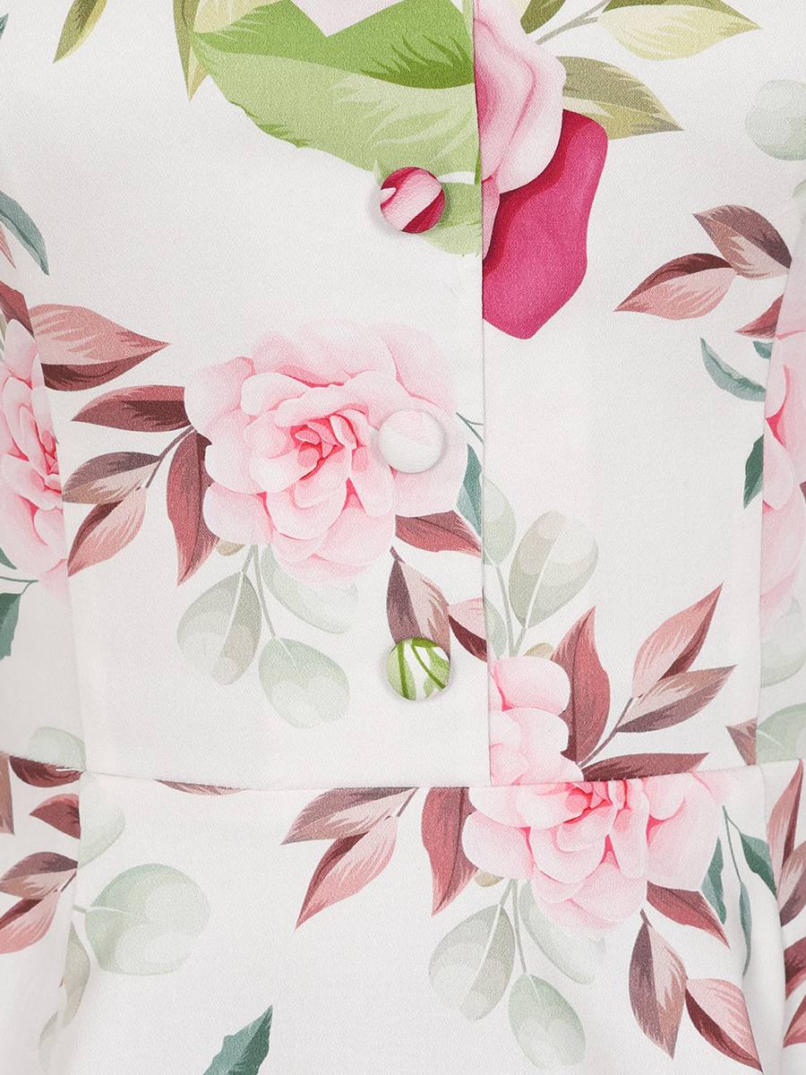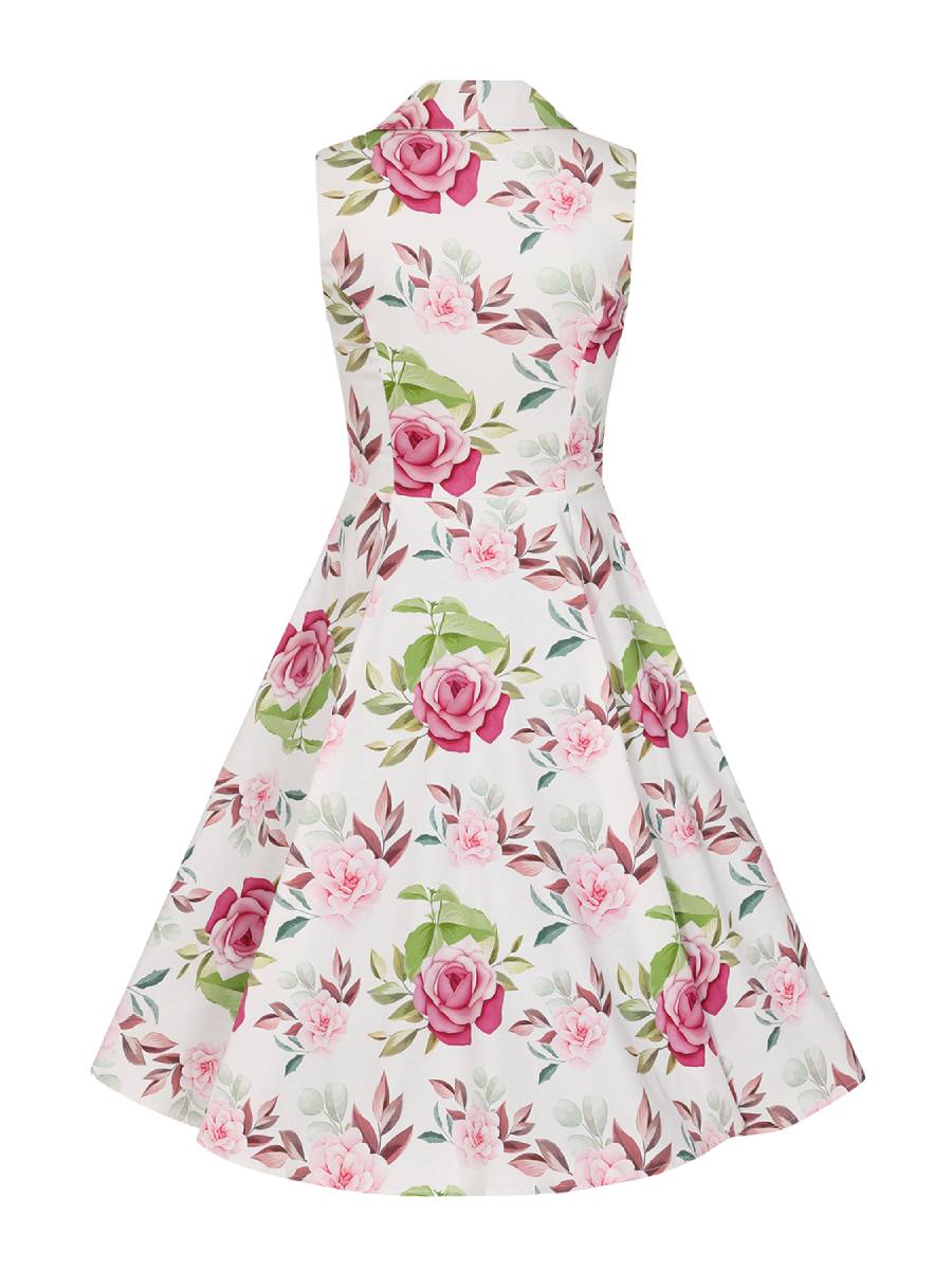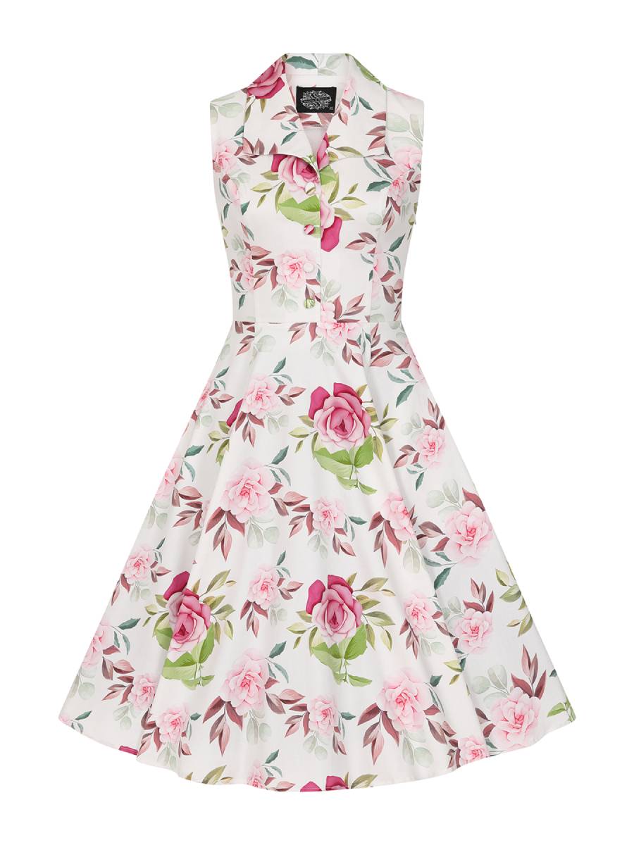 Sommerlich leicht im 50er Jahre Vintage Stil: "Darla Floral Swing Dress" von Hearts & Roses London ist ein perfektes Alltagskleid mit zartem pastelligem Blumenmuster auf weißem Hintergrund. Das ärmellose Kleid hat einen schönen V-Ausschnitt mit Reverskragen und ein figurbetontes Oberteil mit stoffüberzogenen Zierknöpfen vorn. Weit schwingender Rock, so dass das Kleid mit oder ohne Petticoat getragen werden kann. Reißverschluss an der Seite, zwei versteckte seitliche Eingrifftaschen im Rock.
