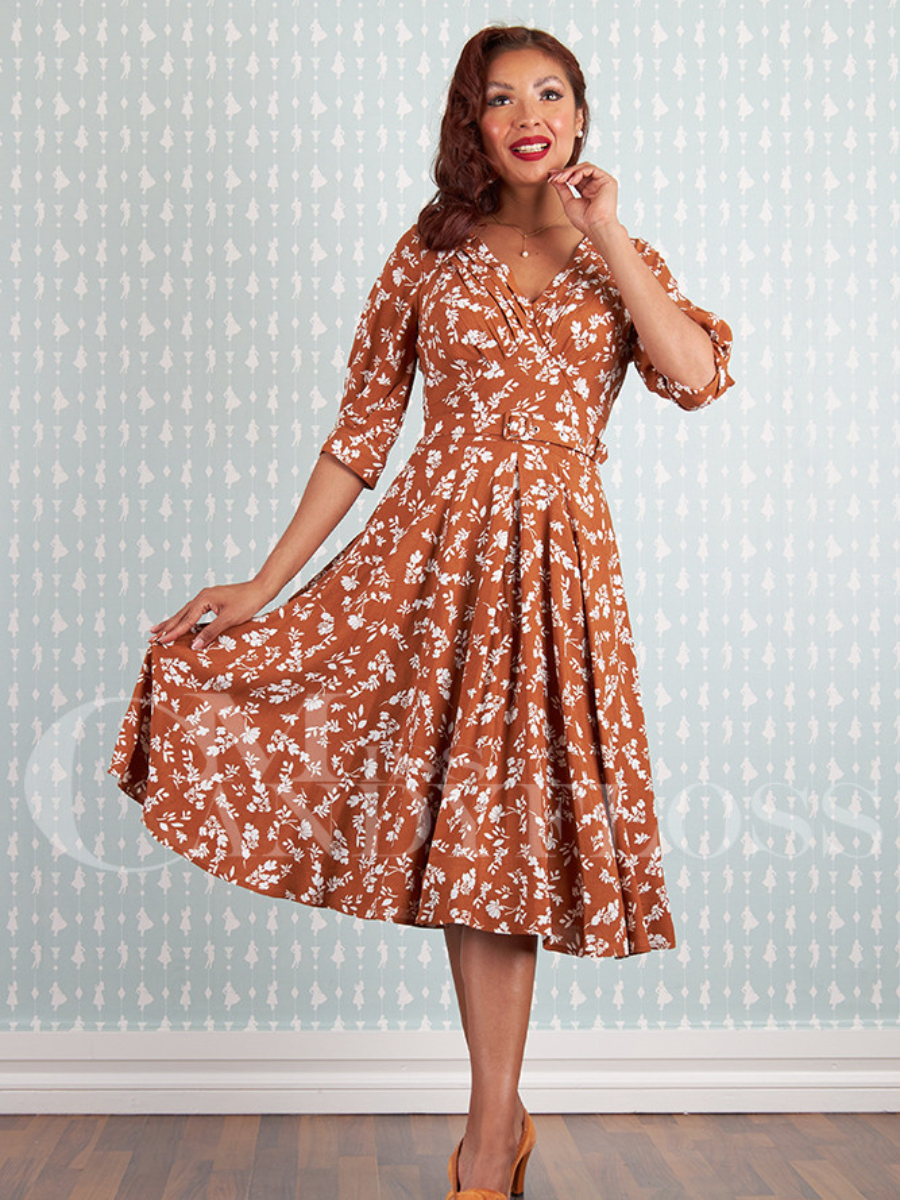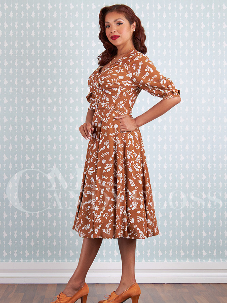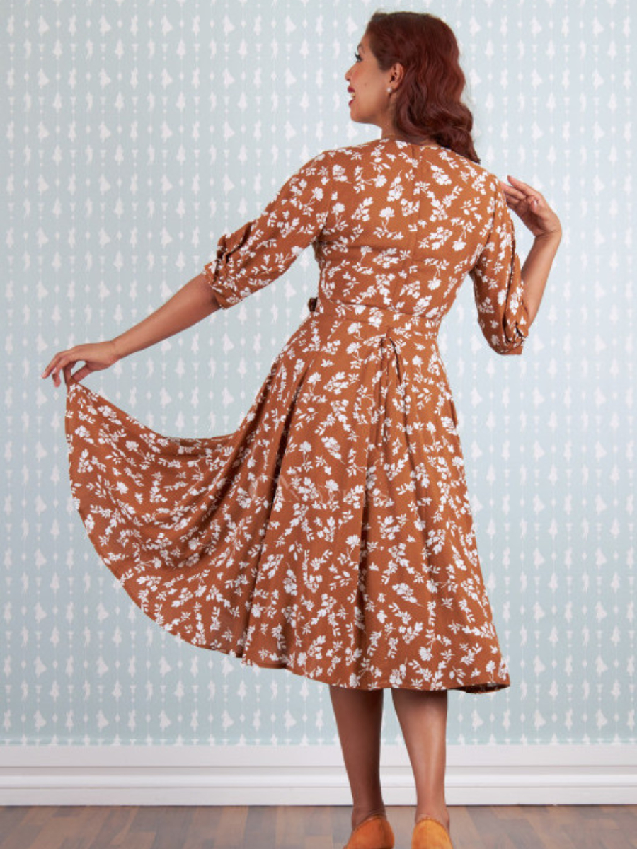 Zauberhafte Herbstfarben: Wunderschönes rotbraunes Swingkleid im 50er Jahre Stil "Ethel Tarnia Swing Dress Terra Floral" von Miss Candyfloss aus reiner Viskose mit cremefarbenem Blumenprint. Figurbetontes Oberteil mit schöner Raffung an der Brust, 3/4 Ärmel mit Ärmelaufschlägen. Weit schwingender Rock mit zwei seitlichen Eingrifftaschen, der passende Stoffgürtel zaubert die perfekte Pinup-Taille. Reißverschluss im Rücken.