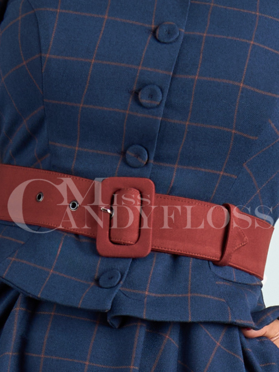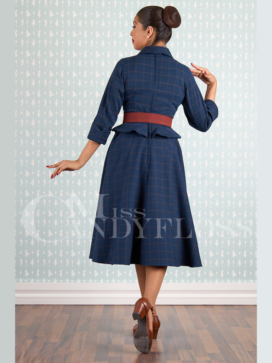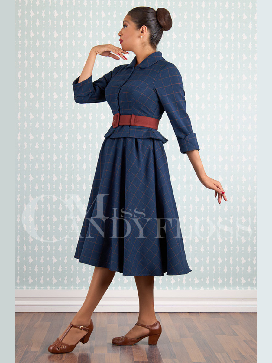 Tauchen Sie ein in die Eleganz der 50er Jahre in Paris, als Models graziös durch die herbstlichen Straßen flanierten. Dieses stilvolle blaue Swingkleid "Maissa-Lee Blazer Dress Navy Sienna" von Miss Candyfloss erinnert an die klassischen Zweiteiler des New Look der späten Vierziger und frühen Fünfziger. Obwohl es mit seinem originalgetreuen Schößchen in der Taille wie ein Set aus Kostümjacke und Rock wirkt, ist es ein raffiniert geschnittenes Blazerkleid im 50er Jahre Stil. Das figurbetonte Oberteil ist hochgeschlossen mit einem hübschen Bubikragen, die Ärmel sind ganz originalgetreu in 3/4 Länge - schließlich trug die Dame von Welt damals Handschuhe und edlen Schmuck am zarten Handgelenk. Der weit schwingende Rock ist in der Taille in Falten gelegt und hat selbstverständlich ganz neuzeitlich zwei praktische Taschen. Der weinrote Stoffgürtel passt perfekt zum dezenten weinroten Karomuster im dunkelblauen Kleid, eine stilvolle Farbkombination für die kühle Jahreszeit. Wie wäre es nun mit einem Herbstspaziergang über die Champs-Elysées?