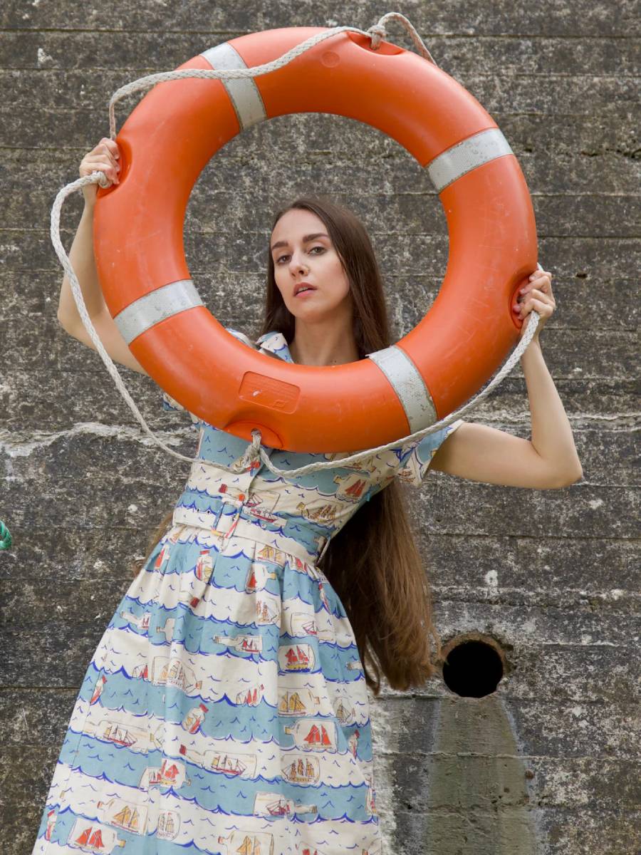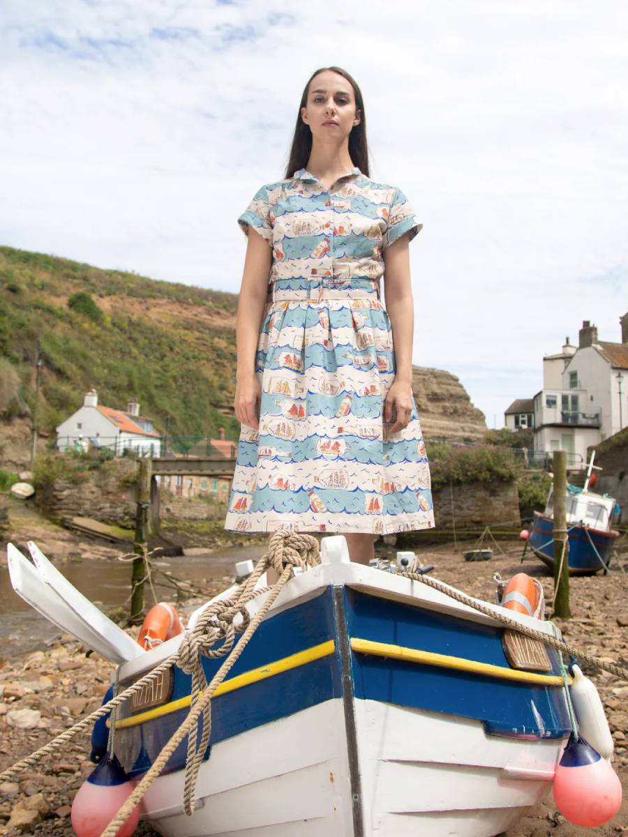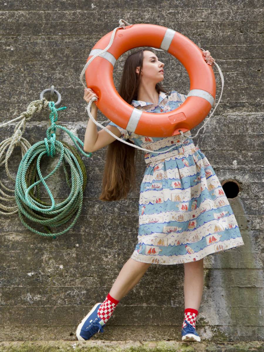 Wir fahren zur See - im Buddelschiff! Dieses schöne Hemdblusenkleid im Vintage Stil "Louise Dress Blue Ships Ahoy" von Palava zeigt einen wunderbaren, von Designerin Bryony exklusiv entworfenen maritimen Print mit liebevoll gezeichneten Schiffen in der Flasche - ganz in der Tradition der Novelty Print-Kleider der 1940er und 1950er Jahre. Das Oberteil wird vorne mit orangefarbenen Knöpfen durchgeknöpft und kann hochgeschlossen oder offen als V-Ausschnitt getragen werden. Dezente Abnäher an der Brust, kurze Ärmel mit Ärmelaufschlag, ausgestellter Rock, der an der Taille in Falten gelegt ist. 2 versteckte Eingrifftaschen im Rock. Seitlicher Reißverschluss, passender 4 cm breiter Stoffgürtel mit Schnalle. Das Material ist ein angenehmer Baumwoll-Leinen-Mix.