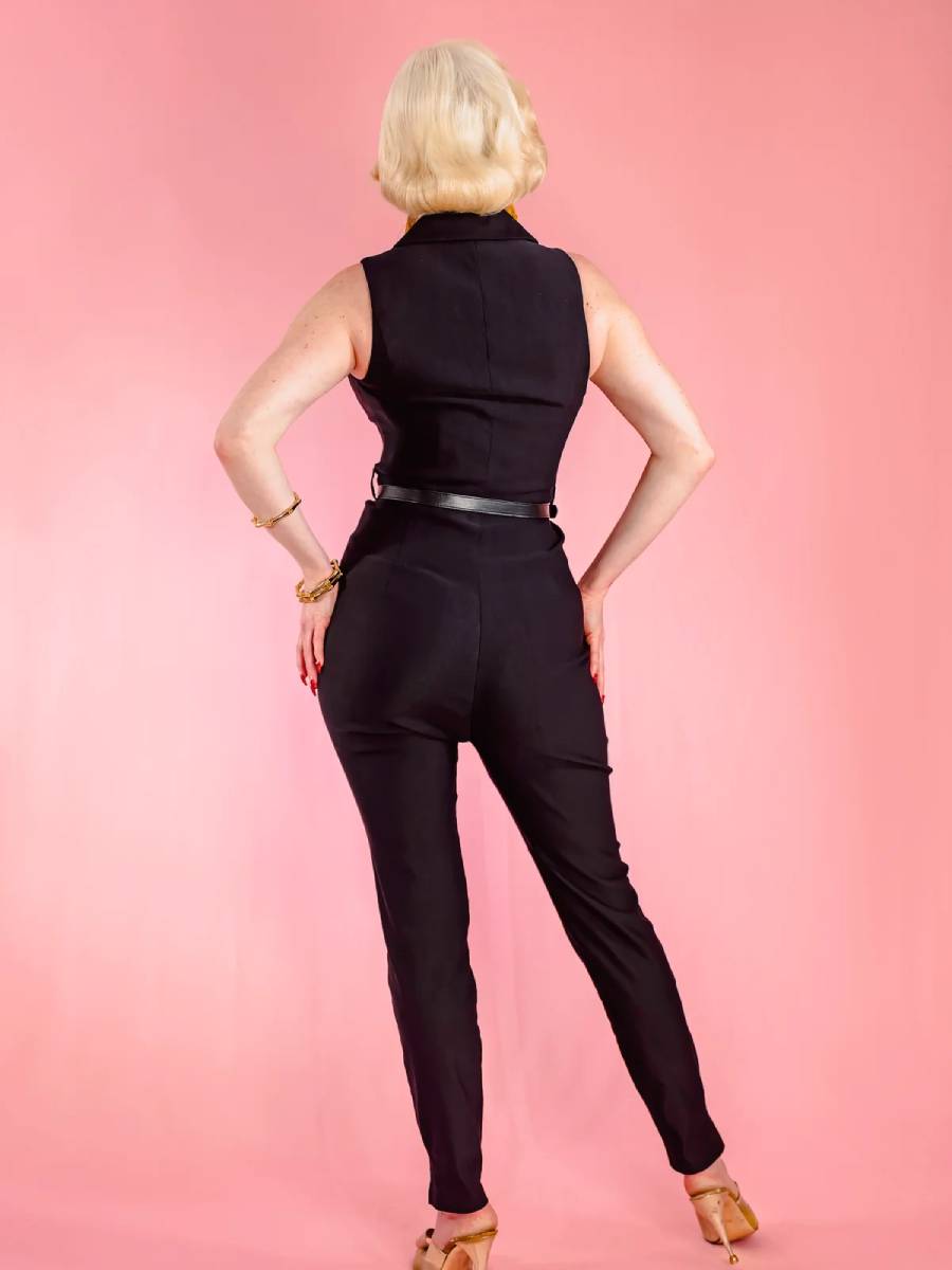 Lust auf eine Zeitreise in die frühen 60er Jahre? Mit einer Party-Einladung vom King of Rock'n'Roll persönlich? Da stellt sich die Frage: Was ziehe ich an? Glamourös soll es sein, sexy und doch so bequem, dass ein wildes Tänzchen möglich ist ... hier kommt die Lösung: Dieser elegante hautenge Jumpsuit im Pinup-Stil "Graceland Jumpsuit" von Rebel Love Clothing betont stretchig alle Kurven und ist doch elastisch genug für möglichst viel Bewegungfreiheit! Das ärmellose Modell lässt nur Ihre Begleiter ins Schwitzen kommen, während Sie dank gefütterten Oberteil cool bleiben, souverän im Mittelpunkt stehen und mit der goldfarbenen Noten-Stickerei am Oberteil genau den richtigen Ton treffen. Der Jumpsuit hat einen schmeichelhaften V-Ausschnitt, der Ihr Dekolleté ins richtige Licht setzt und von einem abgerundeten Kragen umrahmt wird. Die schmale Pinup-Taille wird von einem passenden Kunstledergürtel betont, die Hosenbeine sind hauteng, damit die langen Beine perfekt zur Geltung kommen. Für bequemes Ein- und Aussteigen sorgt der Reißverschluss vorn und statt einem Ass im Ärmel verstecken Sie alles Wichtige in den Hosentaschen. Dieser Rockabilly-Overall sorgt für pures Love Me Tender Gefühl!