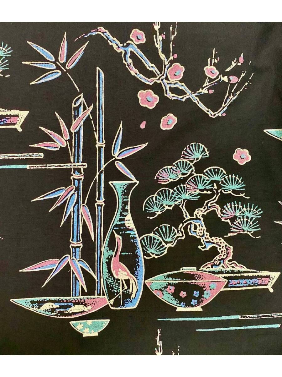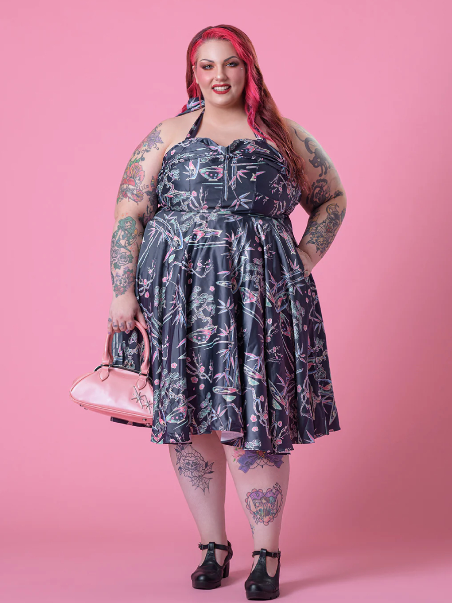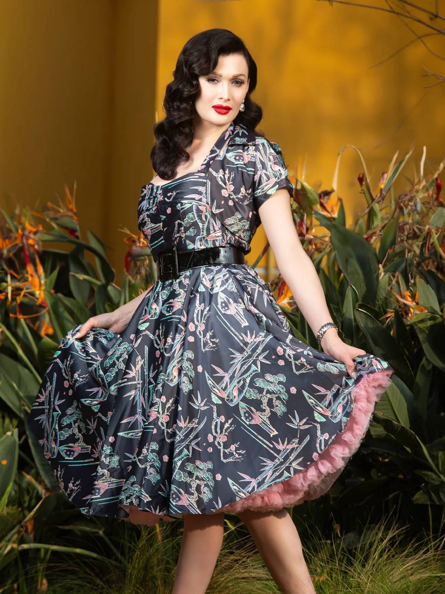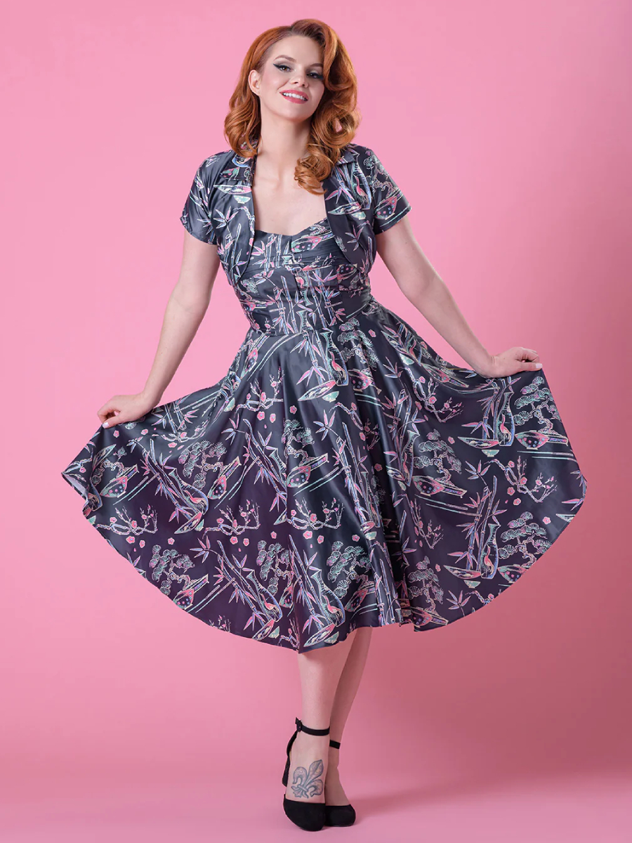 Perfekt für eine Cocktailparty: Extravagantes Neckholder-Swingkleid im 50er Jahre Stil "Soju Swing Dress and Matching Bolero" von Rockin Bettie in einem wunderschönen Novelty Print auf schwarzem Hintergrund und passendem Bolero. Das Kleid hat ein figurbetontes Oberteil mit Smock-Einsatz hinten und gefütterten Cups. Der weit schwingende Rock hat zwei versteckte Eingrifftaschen, ein eingebauter Tüllpetticoat inklusive Unterrock sorgt für die typische ausgestellte Fifties-Form. Das passende Bolerojäckchen hat kurze Ärmel und einen klassischen Kragen, es ist innen rosa gefüttert. Durch den Gummizug im Rücken kommt das Kleid ganz ohne Reißverschluss aus, es ist innen schwarz gefüttert.