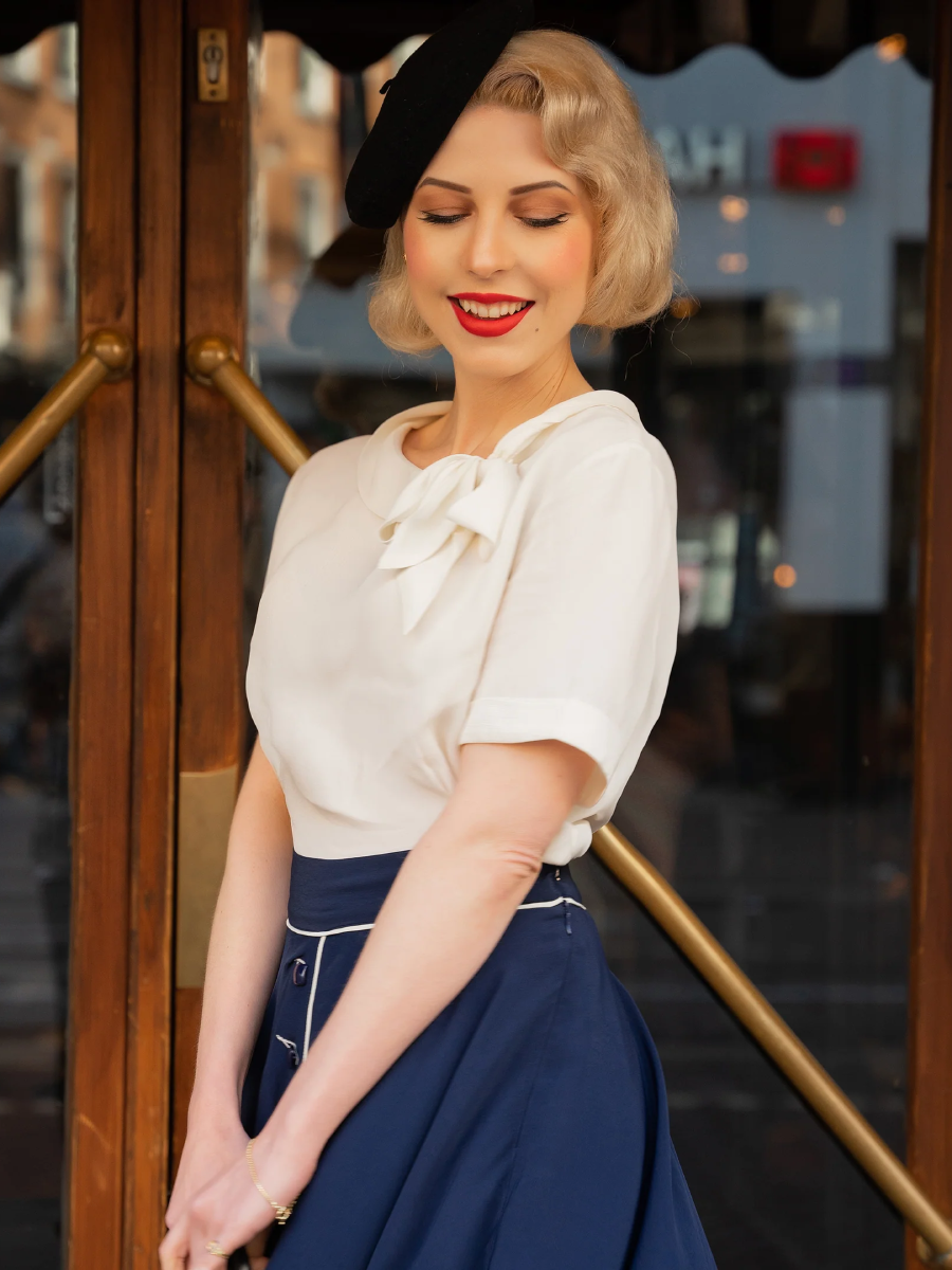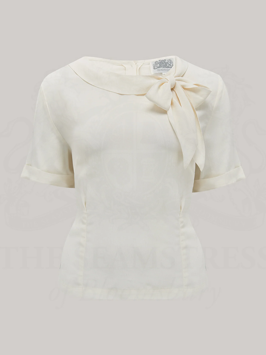 Für einen lässigen Frühlingslook: Cremefarbene Bluse im 40er Jahre Vintage Stil "Cindy Blouse Cream" von The Seamstress of Bloomsbury, eine ideale Ergänzung zu High-Waist-Hosen und -Röcken. Die Bluse ist locker geschnitten mit einem weiten Ausschnitt und Schleife am Kragen. Kurze Ärmel mit Ärmelaufschlag. Ganz originalgetreu wird sie hinten mit kleinen Knöpfen geschlossen. Geschickt platzierte Abnäher über der Brust sorgen für einen guten Sitz.